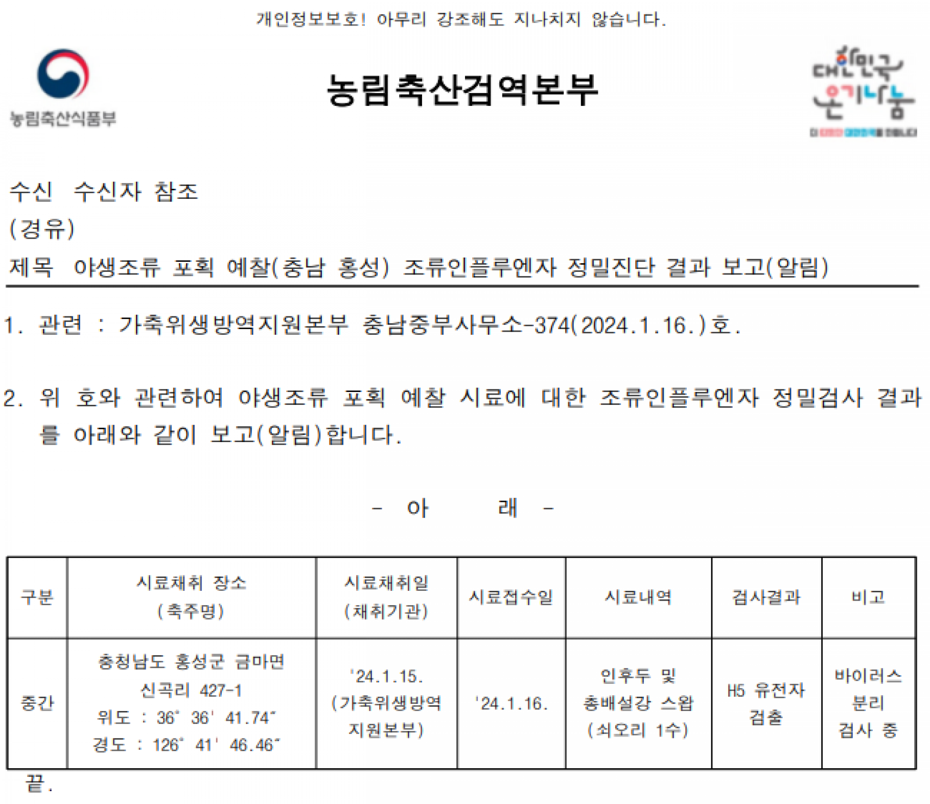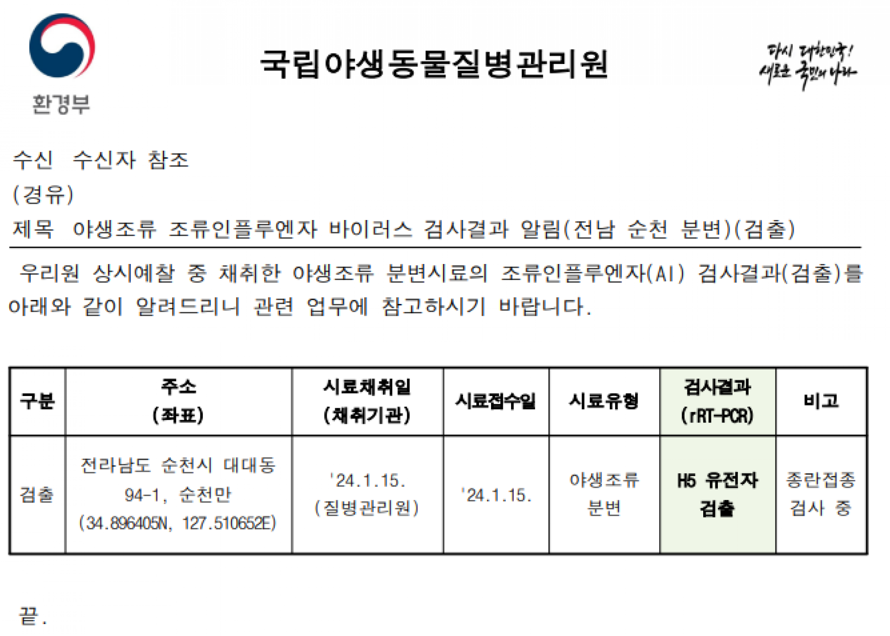 (전남 순천, 충남 홍성)야생조류 H5형 조류인플루엔자(AI) 항원 검출에 따른 차단방역 및 예찰 강화 알림