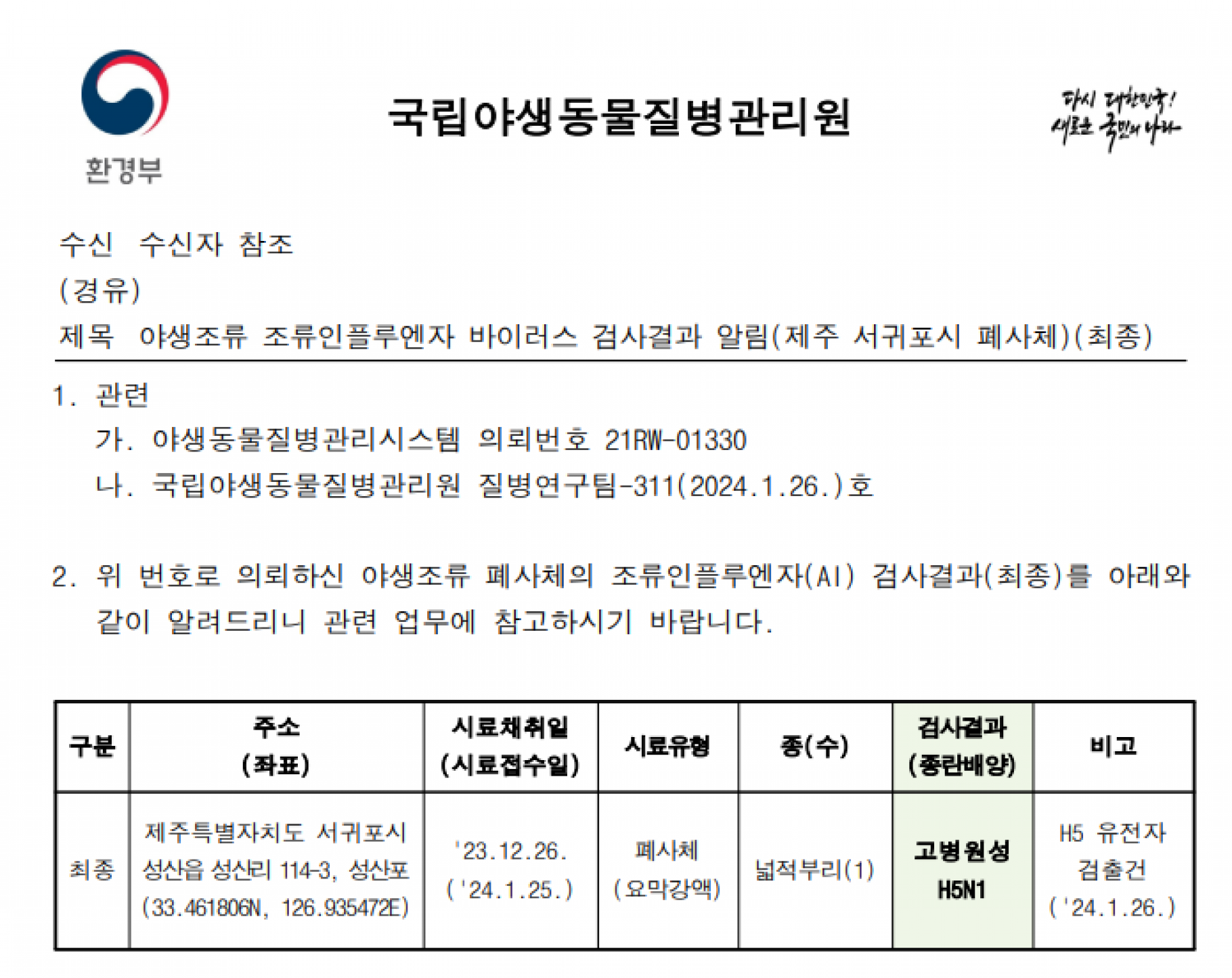 (제주) 야생조류 고병원성 조류인플루엔자(H5N1형) 검출에 따른 차단방역 및 예찰 강화 알림