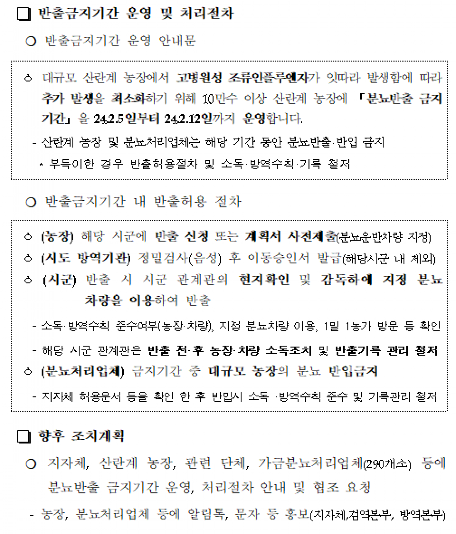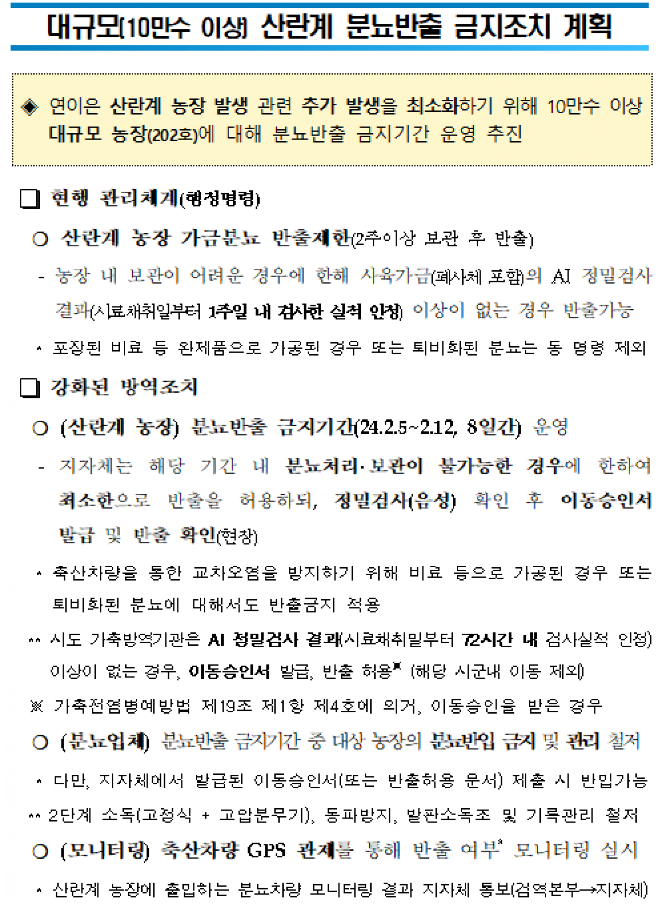 (농식품부) 대규모(10만수 이상) 산란계 분뇨반출 금지조치 계획 |