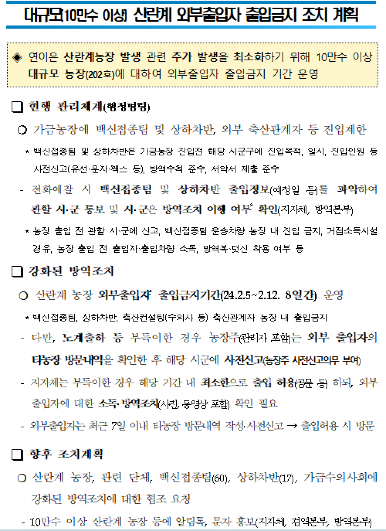 [농식품부] 대규모(10만수 이상) 산란계 외부출입자 출입금지 조치 계획 |