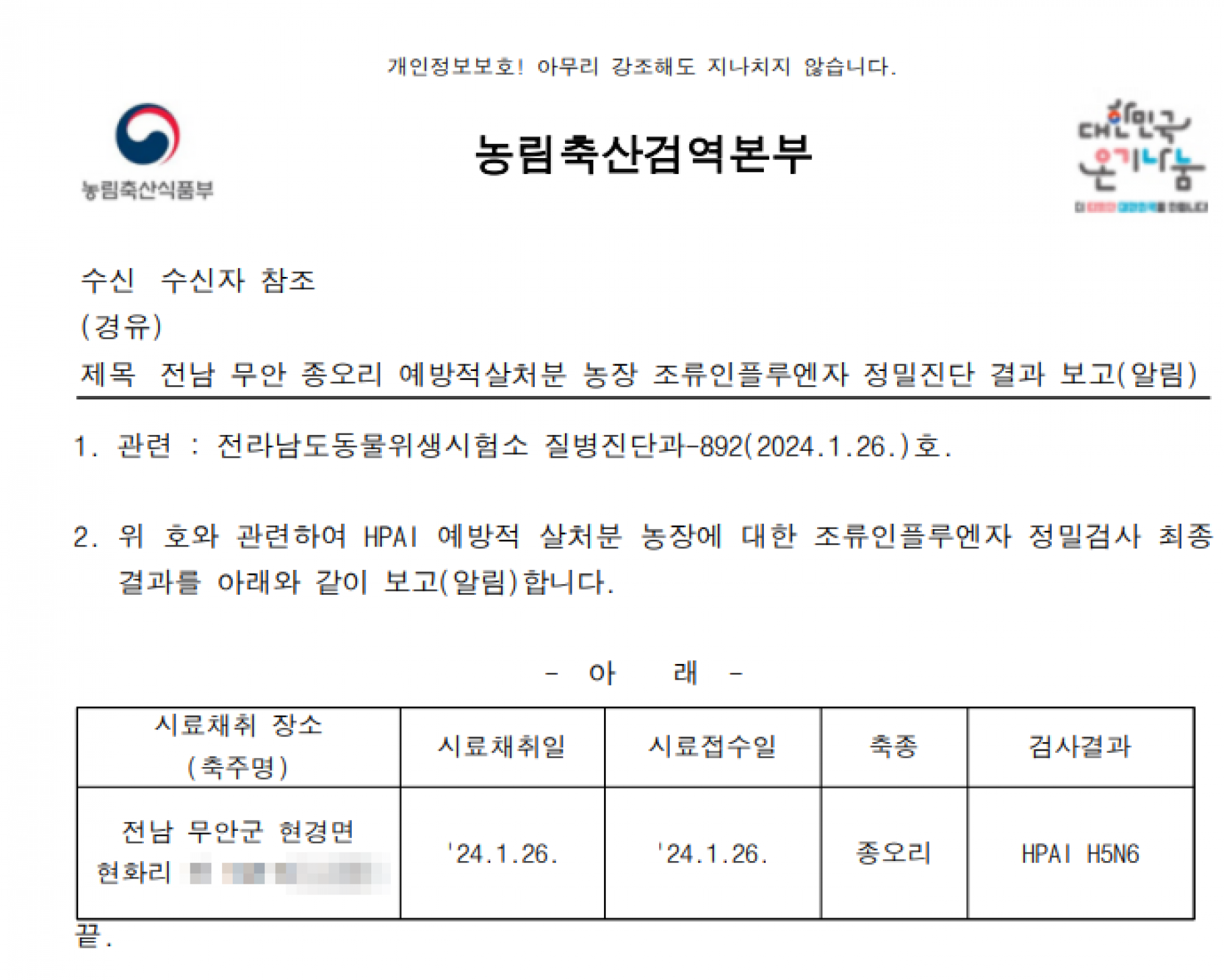 전남 무안 가금농장(종오리) 고병원성 AI 확진에 따른 방역조치 알림