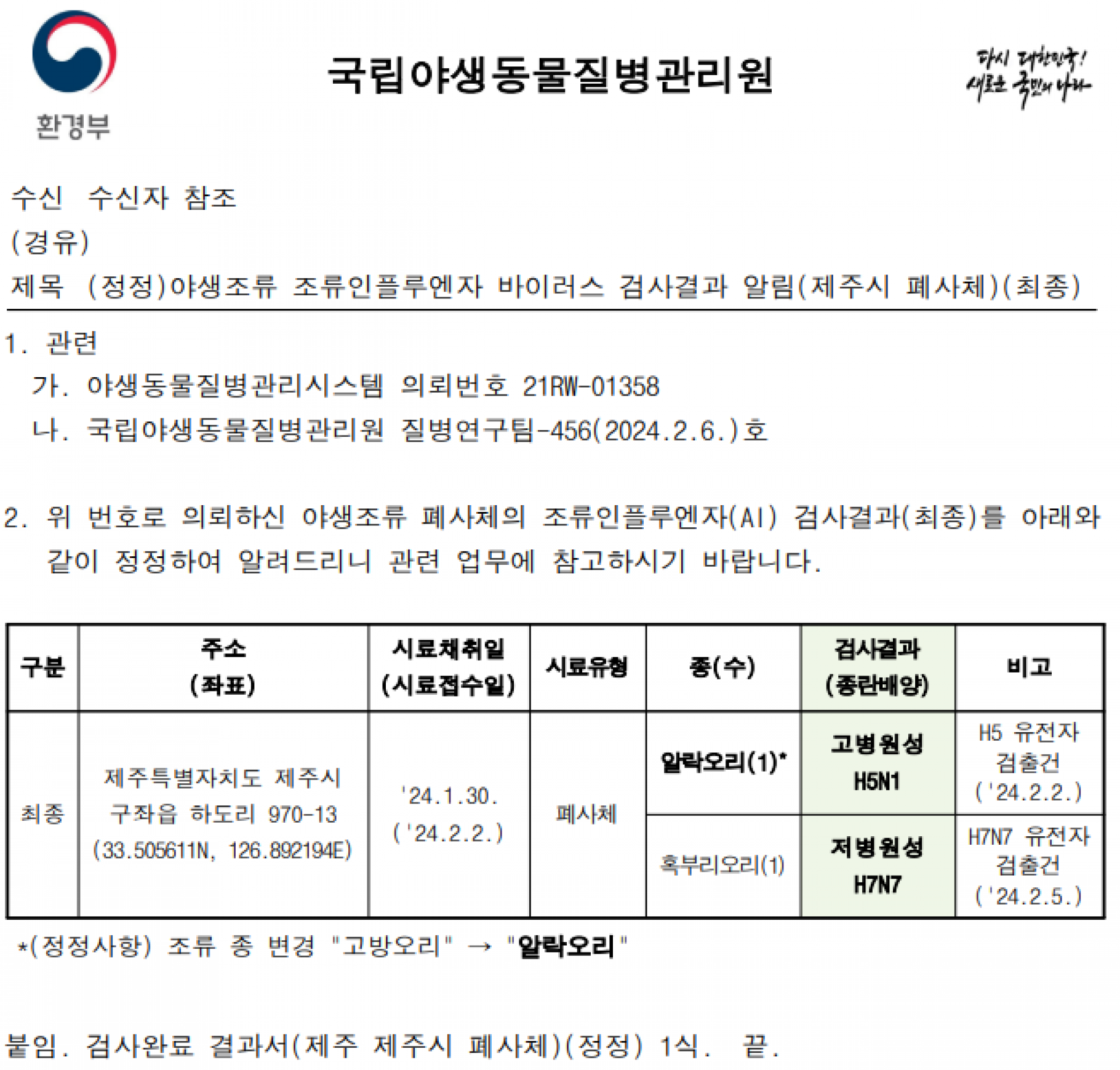 (제주도 제주시)야생조류 H5형 조류인플루엔자(AI) 항원 검출에 따른 차단방역 및 예찰 강화 알림