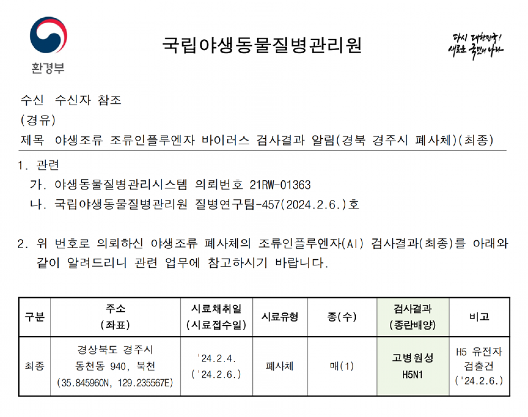 (경주) 야생조류 고병원성 조류인플루엔자(H5N1형) 검출에 따른 차단방역 강화 알림