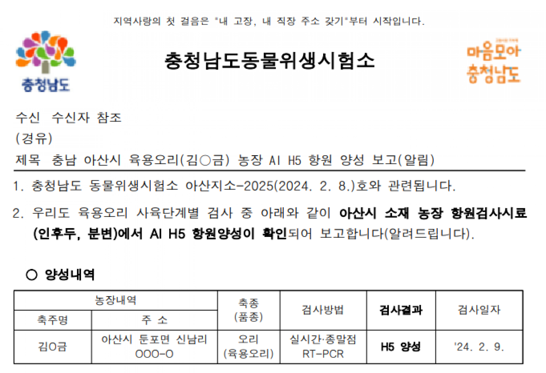 충남 아산시 가금농장(육용오리) 고병원성 AI 의사환축 발생에 따른 방역강화 조치 |