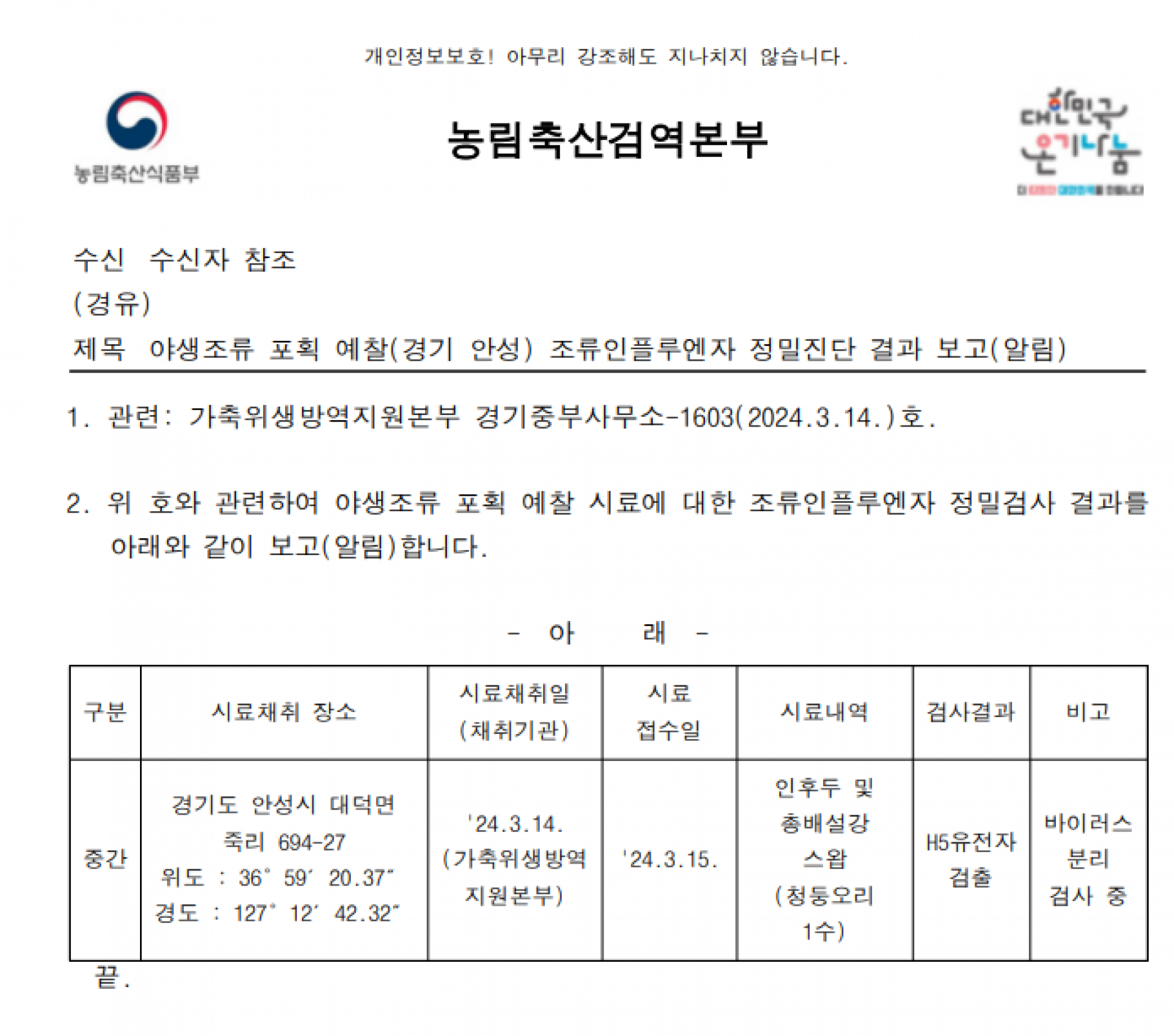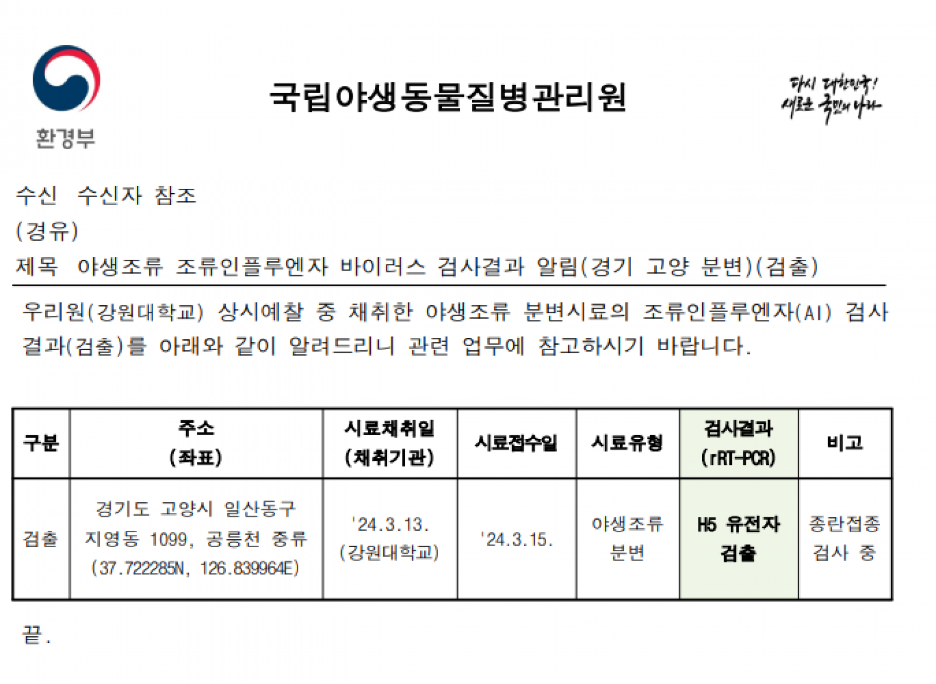 (경기 안성, 경기 고양)야생조류 H5형 조류인플루엔자(AI) 항원 검출에 따른 차단방역 및 예찰 강화 알림