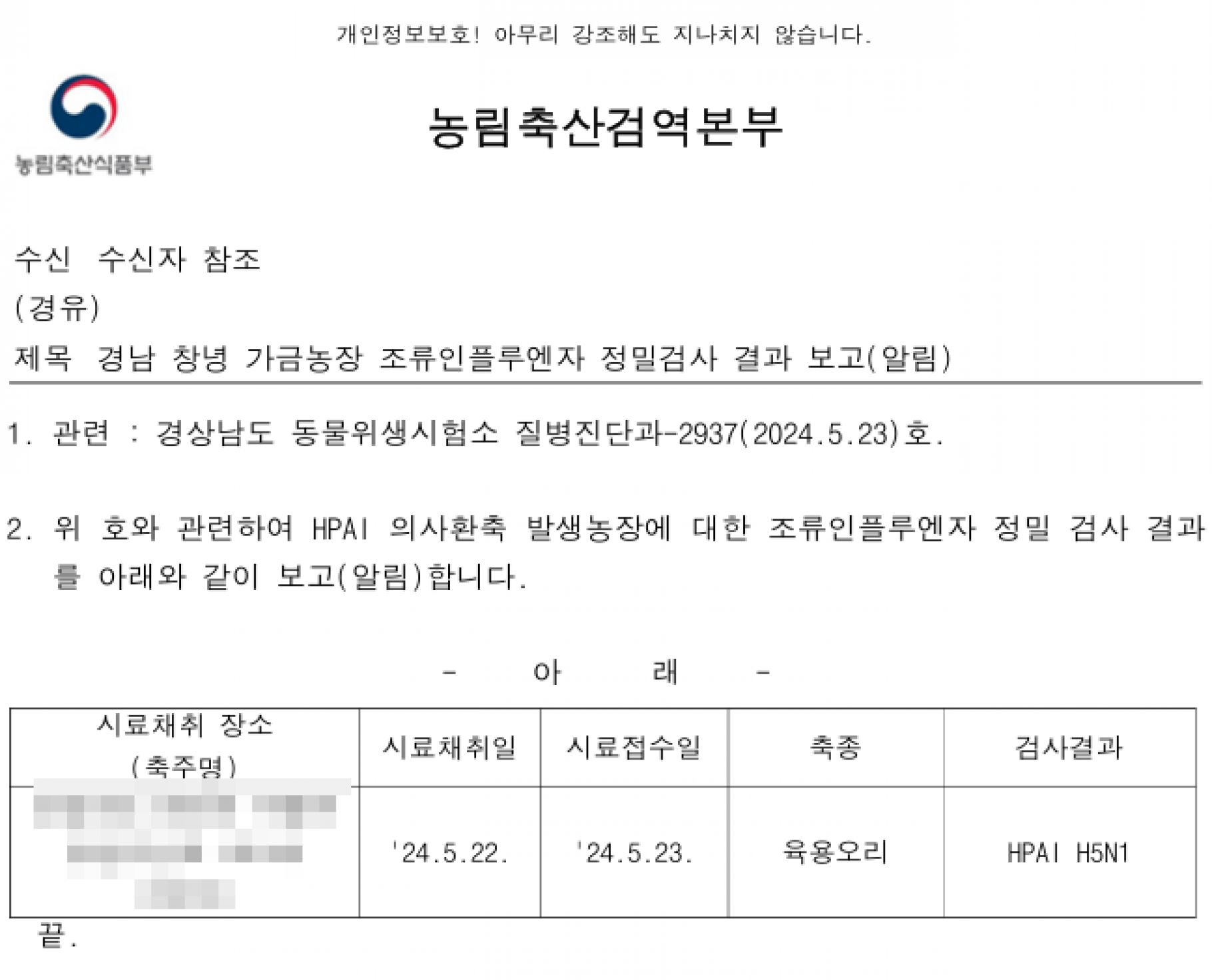 경남 창녕 가금농장 조류인플루엔자 정밀 검사 결과 보고(알림)
