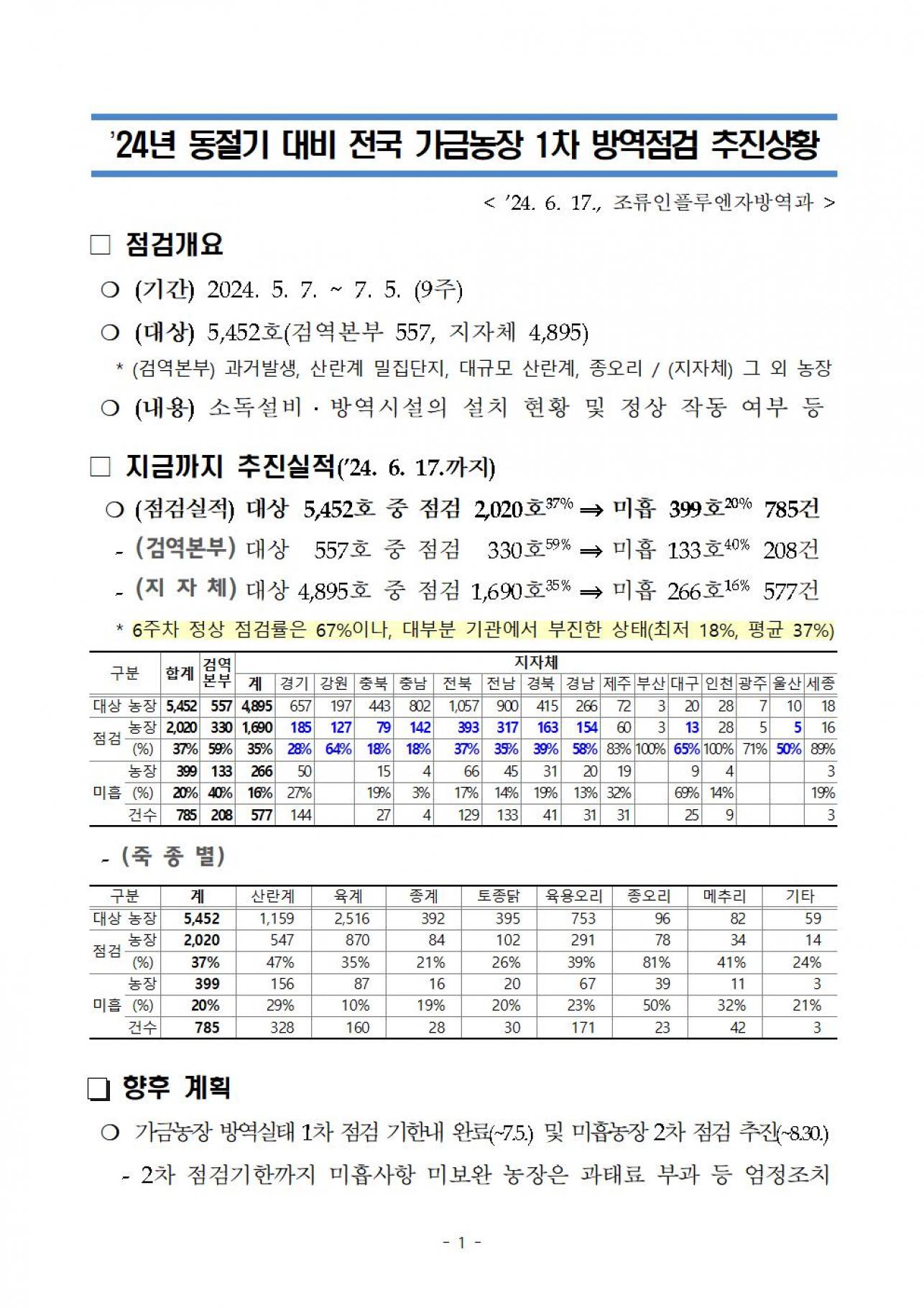 | ’24년 동절기 대비 전국 가금농장 1차 방역점검 추진상황 240617(6주차).hwpx | |||