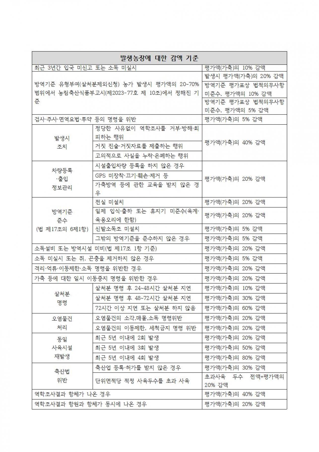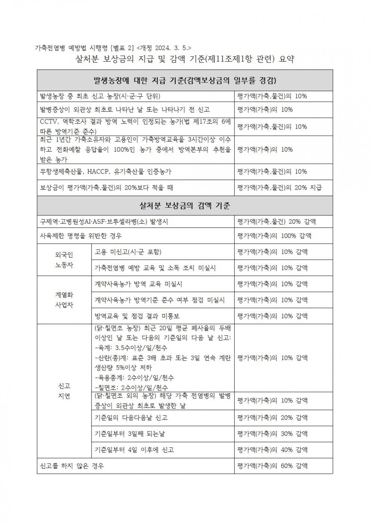 살처분 보상금의 지급 및 감액 기준(제11조 제1항 관련)요약