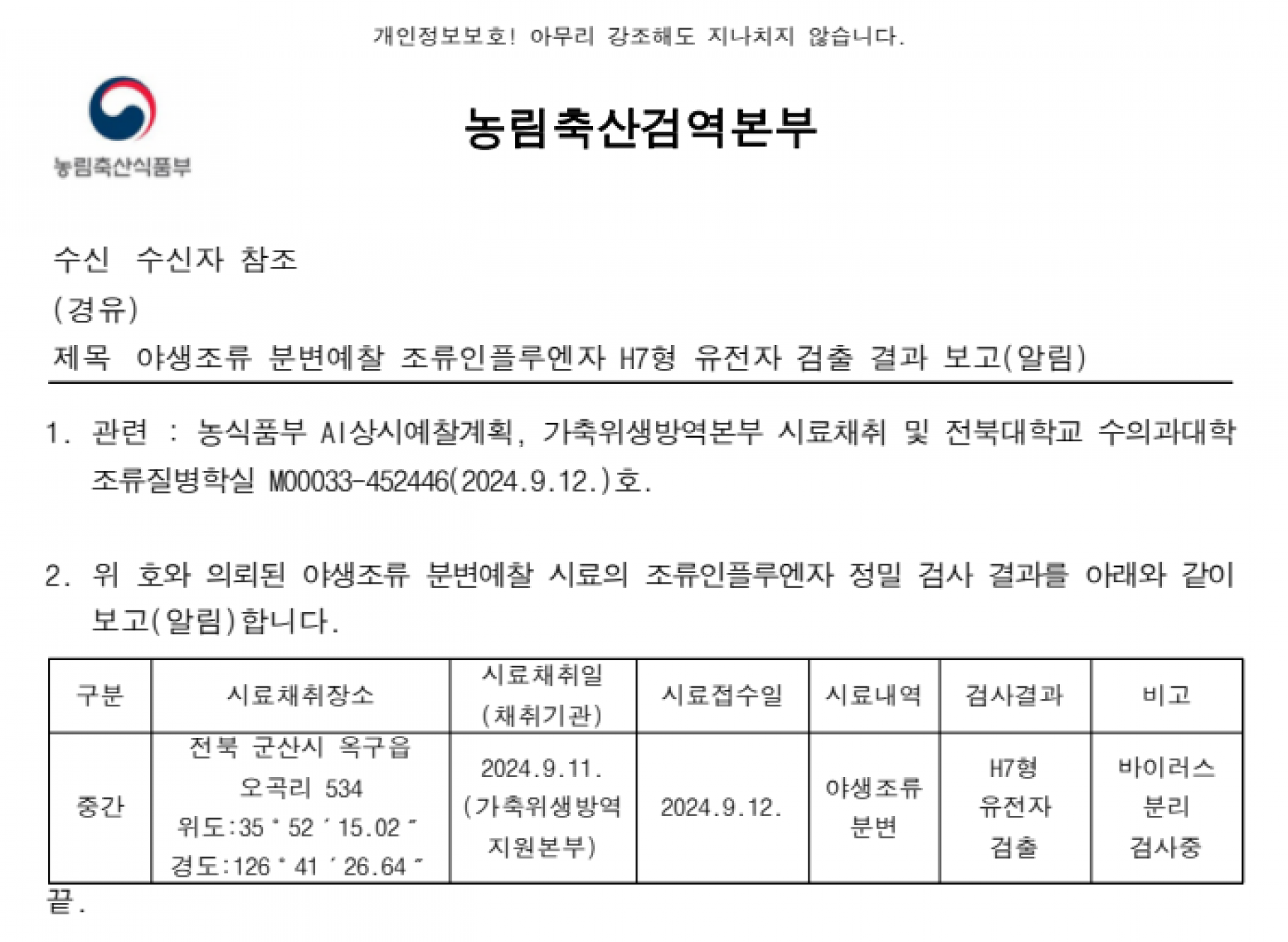 (전북 군산) 야생조류 H7형 조류인플루엔자(AI) 항원 검출에 따른 차단방역 및 예찰 강화 알림