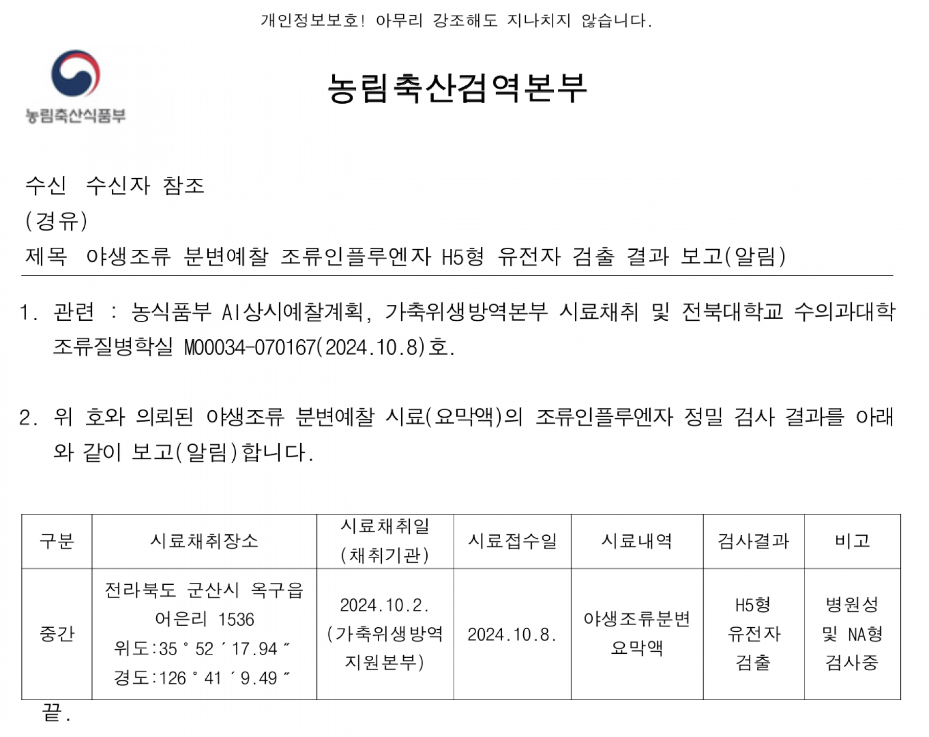 (전북 군산) 야생조류 분변예찰 조류인플루엔자 H5형 유전자 검출 결과 보고(알림)