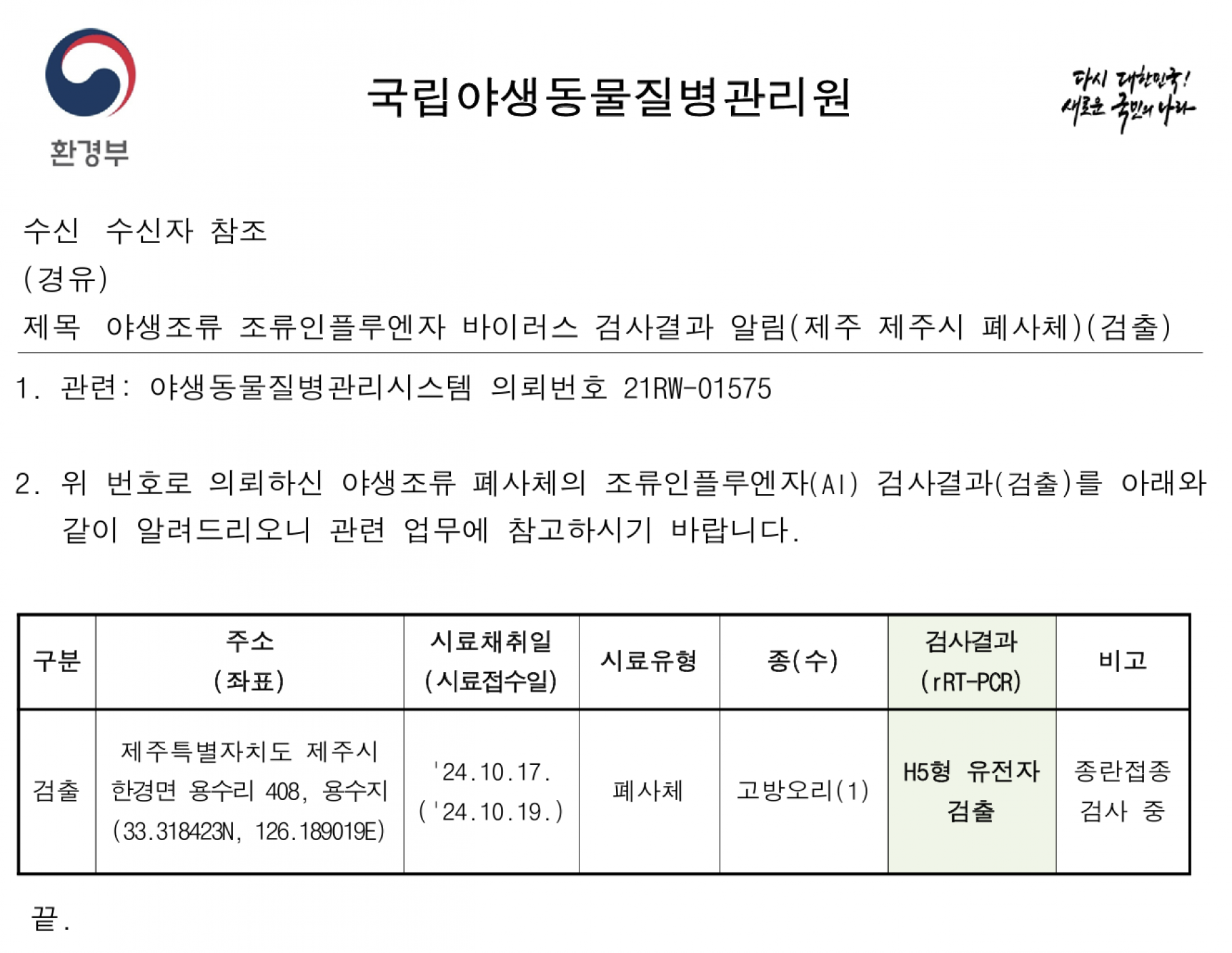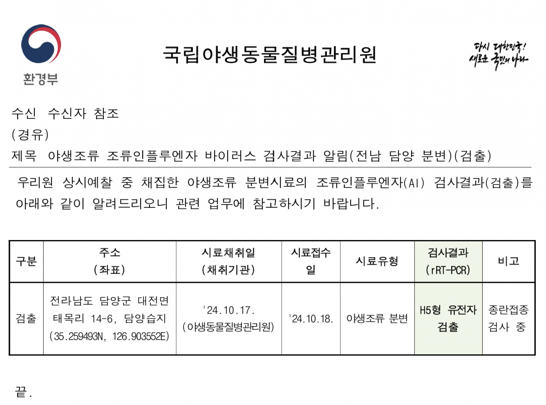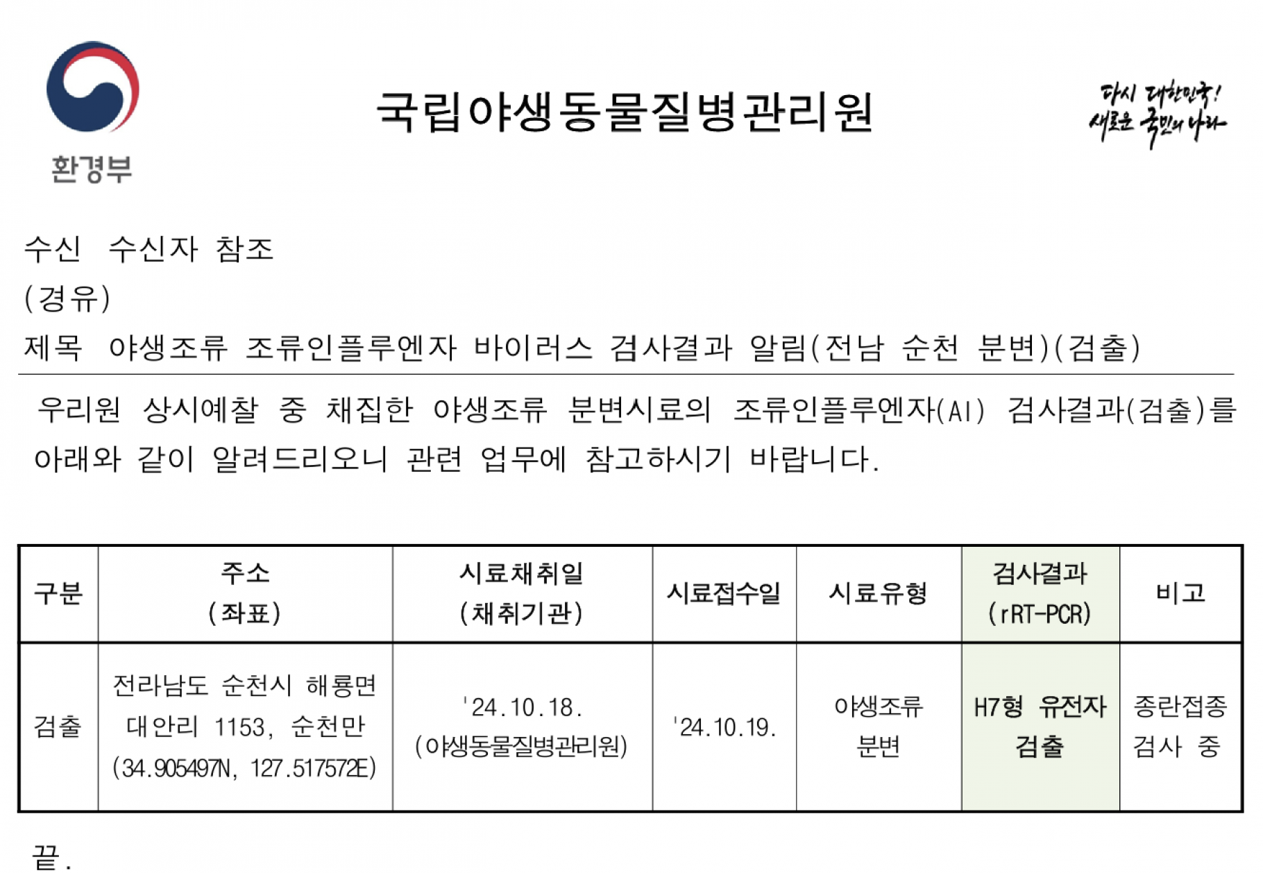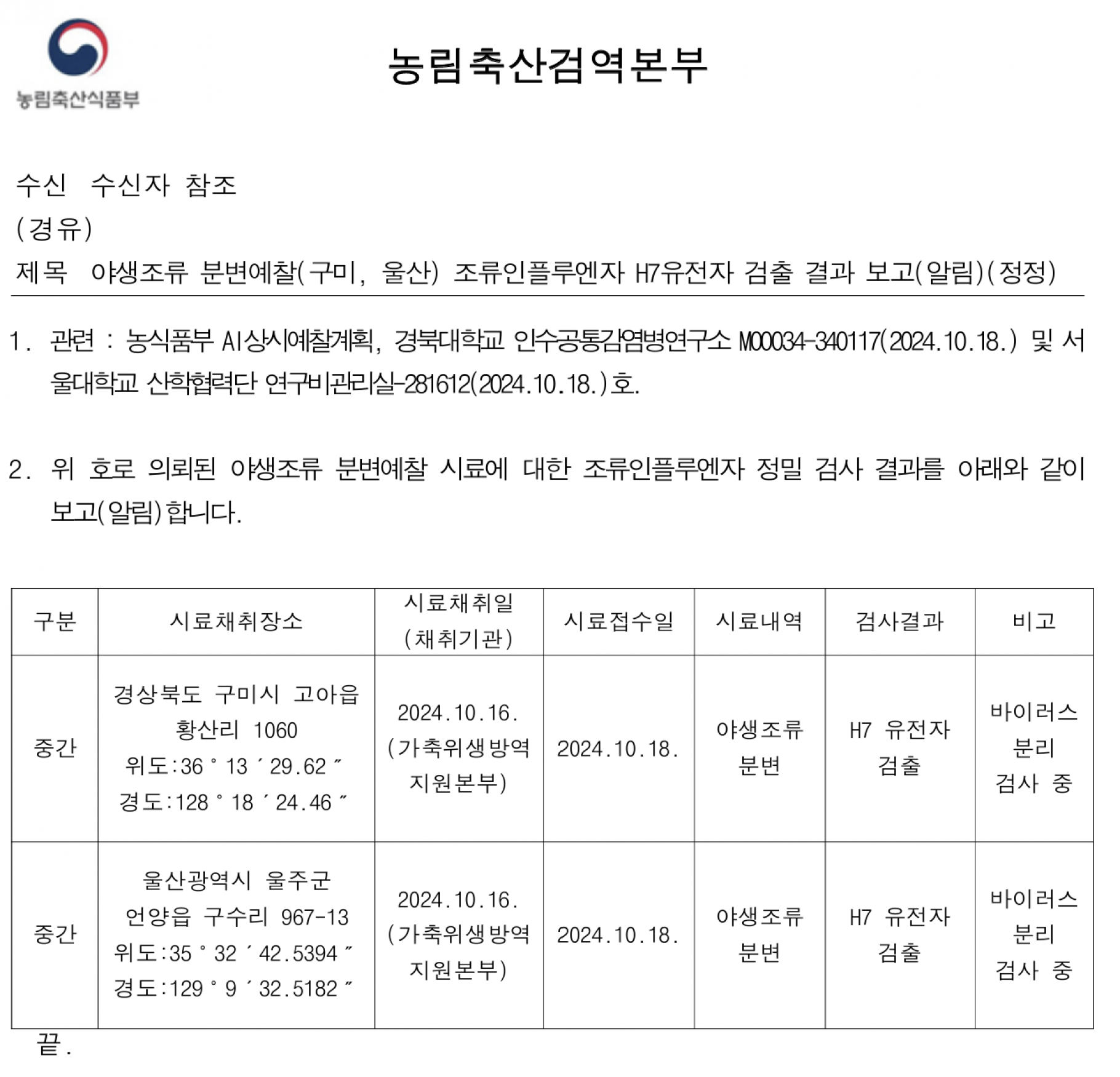 (구미, 울산, 담양, 순천, 제주) 야생조류 조류인플루엔자 바이러스 검출 결과 보고