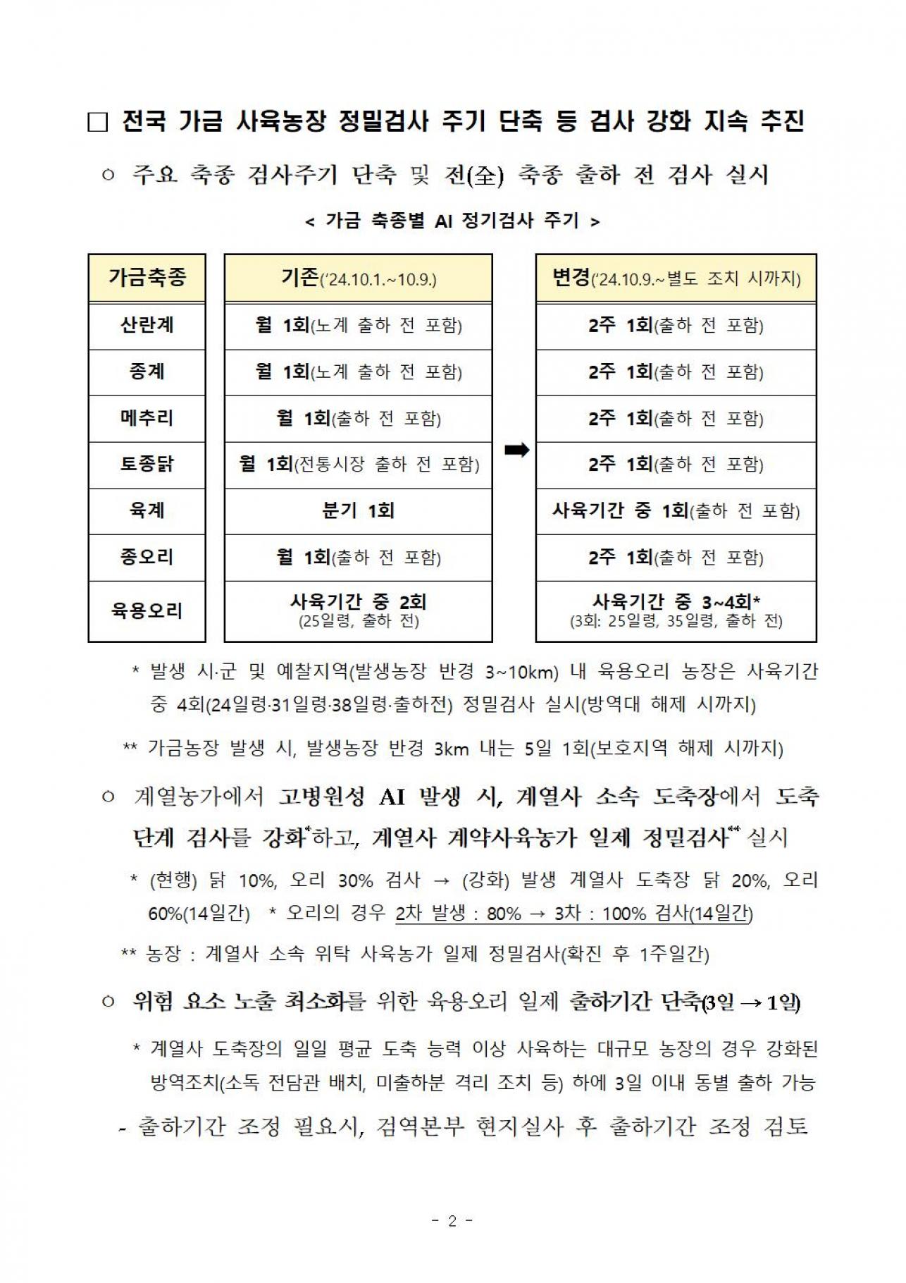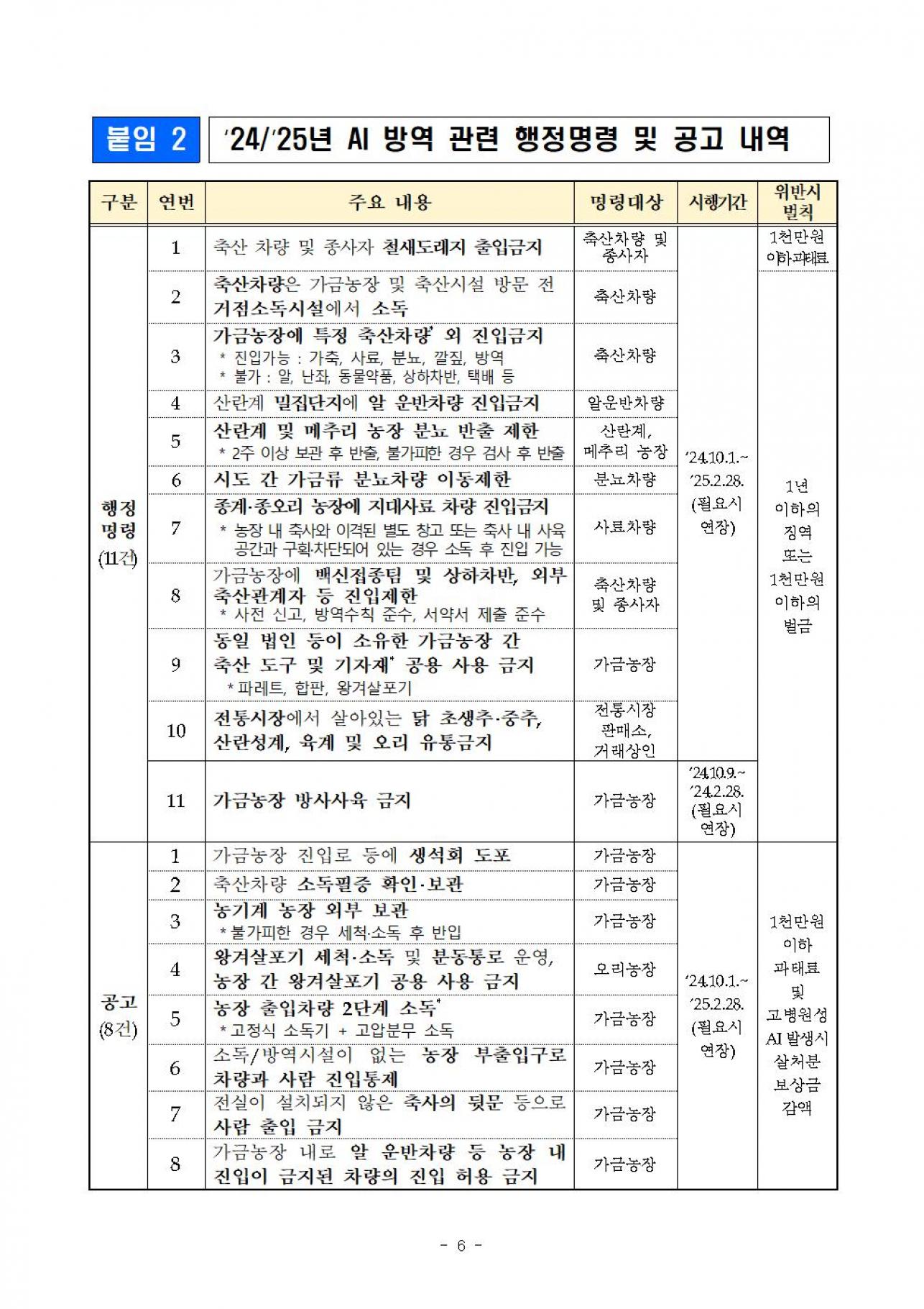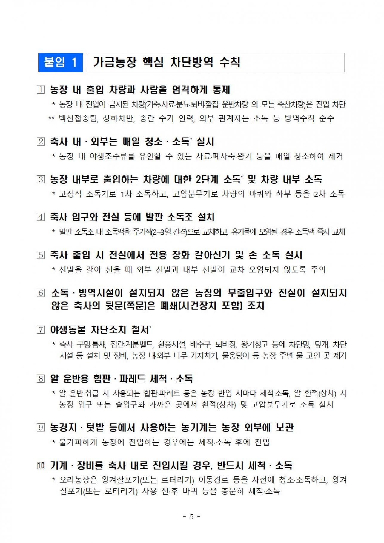 금년 동절기 국내 야생조류에서 2가지 혈청형(H5N3형(전북 군산), H5N1형(경기 용인))의 고병원성 조류인플루엔자(AI)가 검출되는 등 전국 모든 가금농장이 안심할 수 없는 엄중한 상황입니다. 이에 정부는 가금농가에서의 고병원성 조류인플루엔자 발생 방지 및 확산 차단을 위해 협회 홈페이지 붙임자료와 같이 밀집사육단지 특별관리, 전국 가금 사육농장 정밀검사 주기 단축 등의 방역조치 계획을 마련하였습니다. 농가에서는 해당 내용을 숙지하시어, 방역수칙이 철저히 준수될 수 있도록 만전을 기해주시기 바랍니다. ![]() ![]() ![]() ![]() ![]()