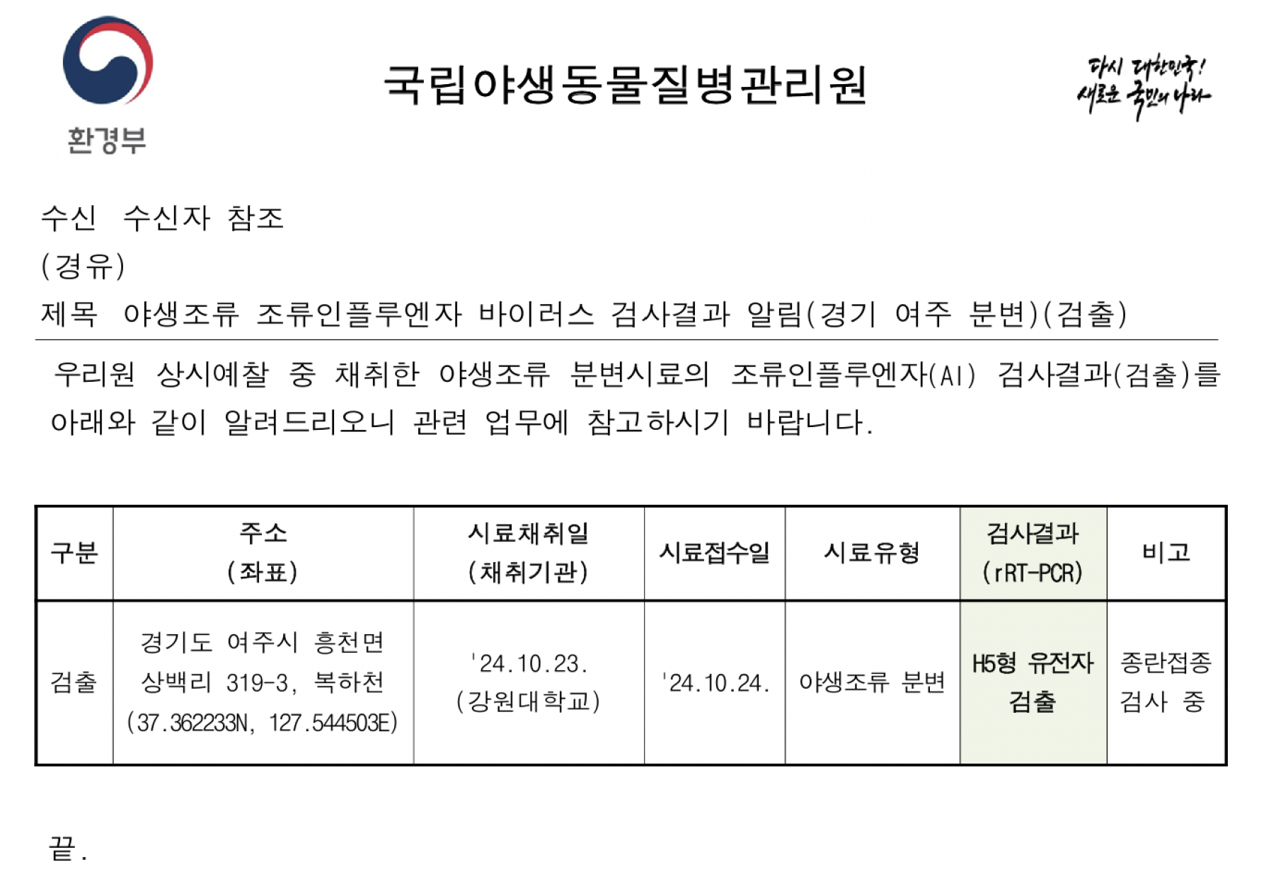 (경기도 여주)야생조류 조류인플루엔자(H5형) 항원 검출에 따른 차단방역 및 예찰 강화 알림