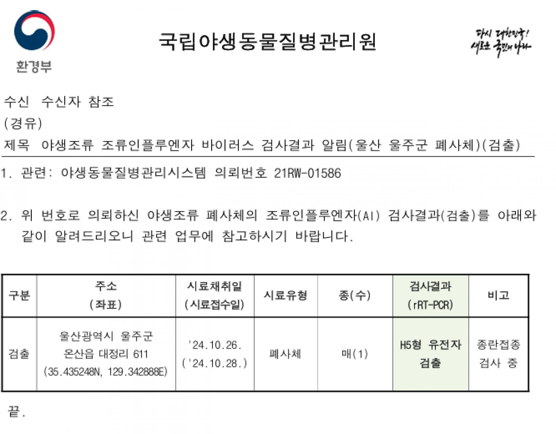 (울산 울주군) 야생조류 조류인플루엔자(H5형) 항원 검출에 따른 차단방역 및 예찰 강화 알림