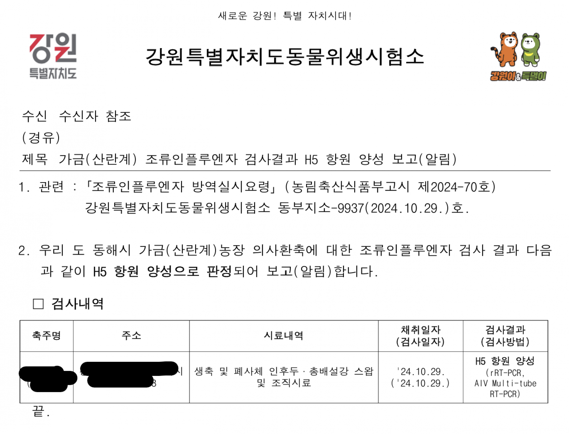 (강원 동해) 고병원성 조류인플루엔자(AI) 의사환축 발생에 따른 방역강화 조치 알림