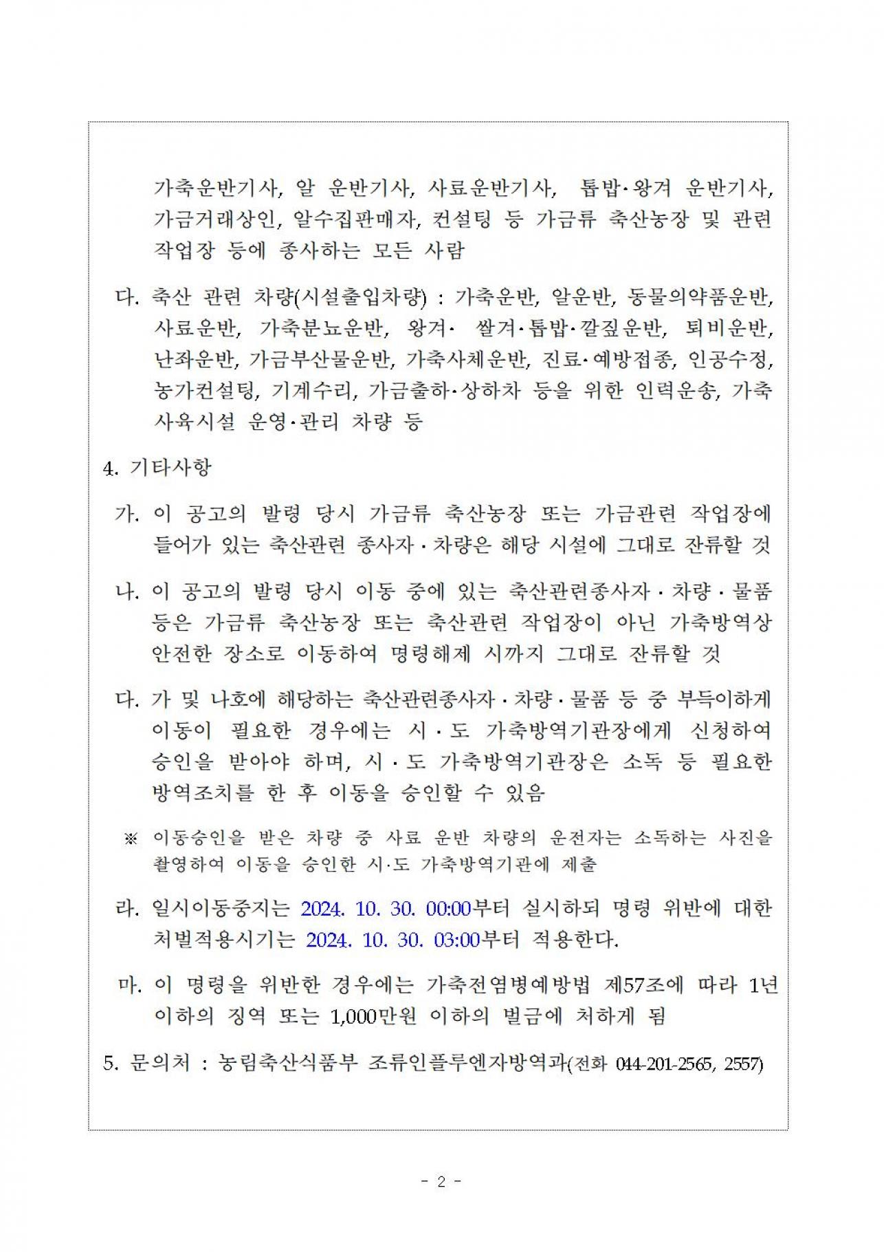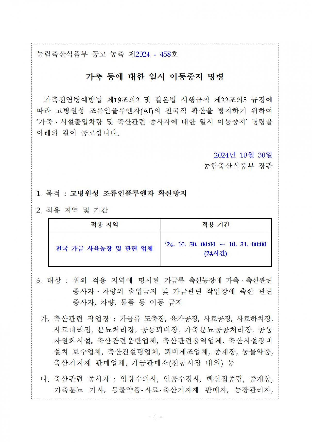 정부는 강원도 동해시 산란계 사육농장에서 고병원성 조류인플루엔자 의사환축(H5형)이 확인됨에 따라 확산을 차단하기 위하여 아래와 같이 가축등에 대한 일시 이동중지 명령을 발령합니다. 가. 적용기간: 2024.10.30. 00:00 ~ 10.31. 00:00 (24시간) *일시 이동중지는 '24. 10.30. 00:00부터 실시하되, 명령 위반에 대한 처벌은 '24. 10. 30. 03:00부터 적용 나 적용지역: 전국 다 적용대상: 가금사육 축산농장, 작업장 종사자, 축산차량 등 *이동허용조건: 부득이한 상황 발생으로 사람 또는 차량의 이동이 필요한 경우, 이동승인서 발급 후 허용 ![]()