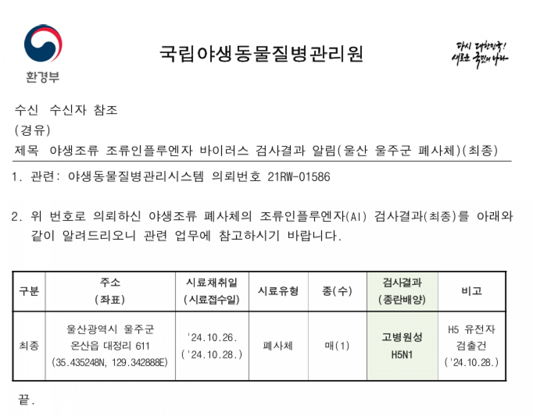 (울산 울주군) 야생조류 조류인플루엔자(H5N1형) 항원 검출에 따른 차단방역 및 예찰 강화 알림