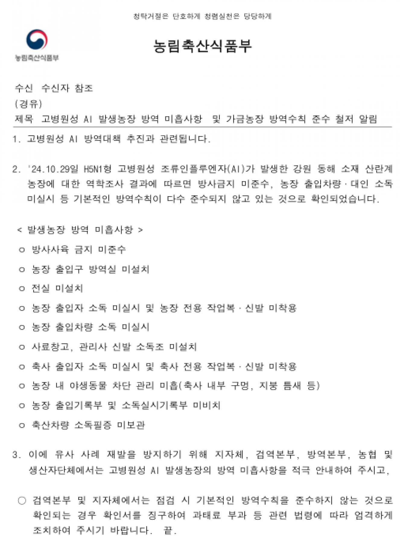 고병원성 AI 발생농장 방역 미흡사항 및 가금농장 방역수칙 준수 철저 알림 |