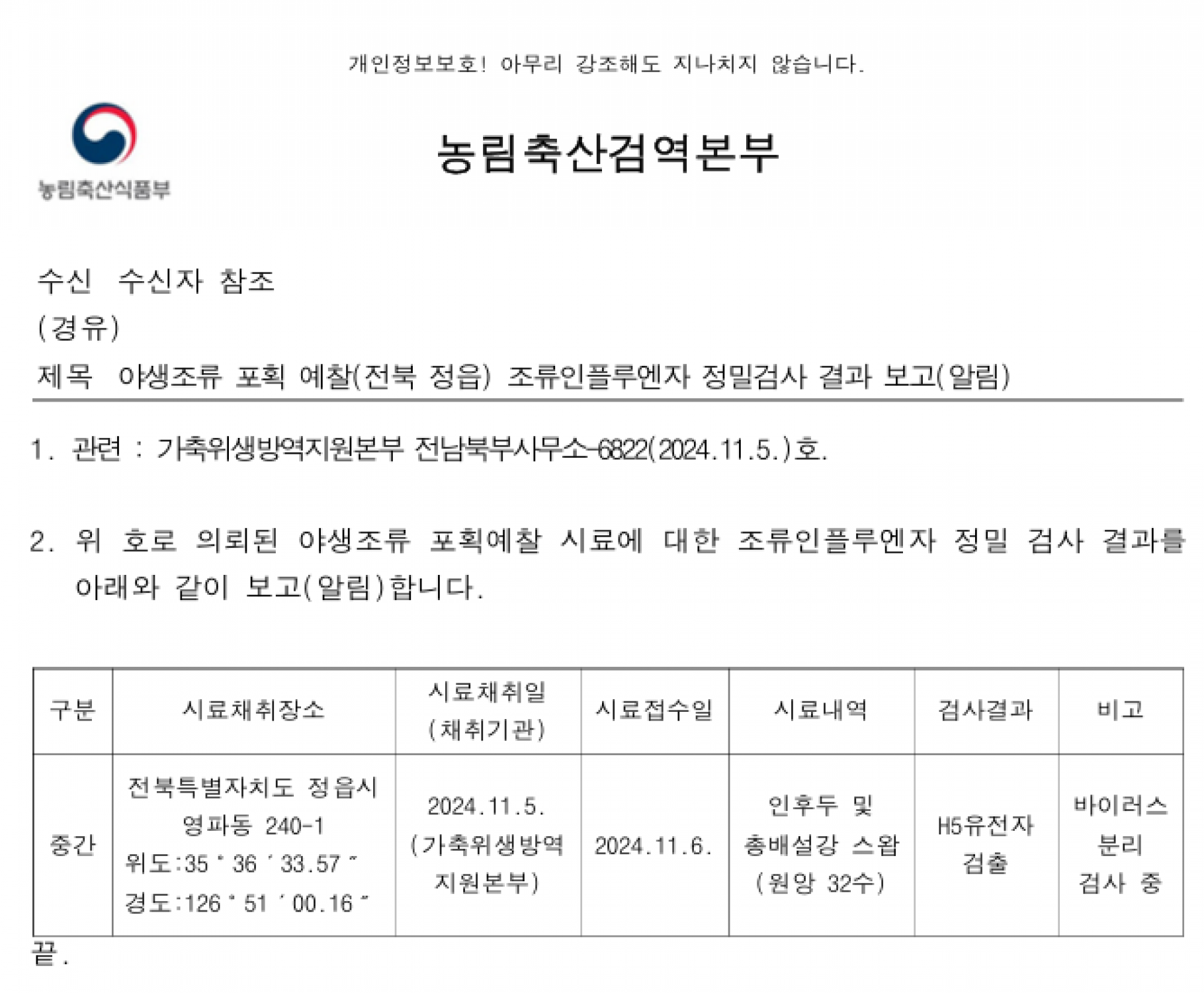 (전북 정읍)야생조류 H5형 조류인플루엔자(AI) 항원 검출에 따른 차단방역 및 예찰 강화 알림