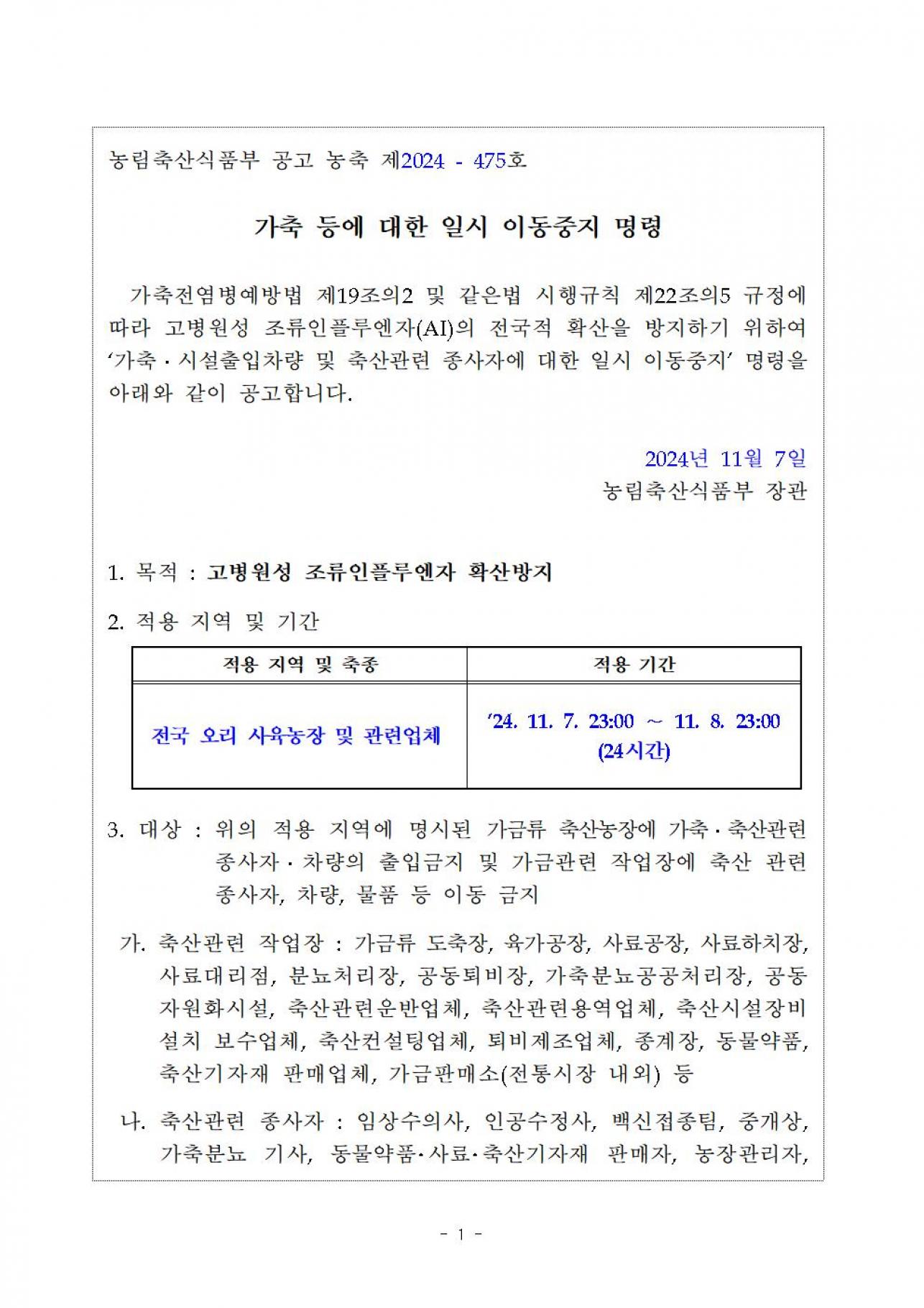 가축(가금_오리) 등에 대한 일시 이동중지(Standstill)명령 발령 알림 |