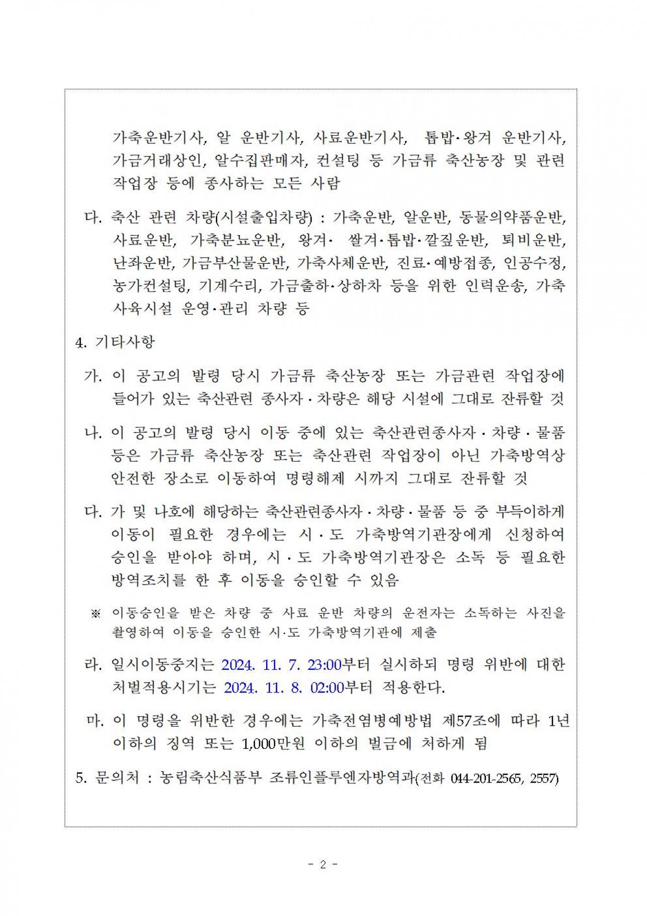 충청북도 음성군 육용오리 사육농장에서 고병원성 조류인플루엔자 의사환축(H5형)이 확인됨에 따라 확산을 차단하기 위하여 아래와 같이 가축등에 대한 일시 이동중지 명령을 발령합니다. 가. 적용기간 : 2024.11.7. 23:00 ~ 11.8. 23:00 (24시간) *일시 이동중지는 '24.11.7. 23:00부터 실시하되, 명령 위반에 대한 처벌은 '24.11.8. 02:00부터 적용 나. 적용지역 : 전국 다. 적용대상 : 오리사육 축산농장, 작업장, 종사자, 축산차량 등 *이동 허용 조건 부득이한 상황 발생으로 사람 또는 차량의 이동이 필요한 경우, 이동승인서 발급 후 허용 ![]() ![]() |