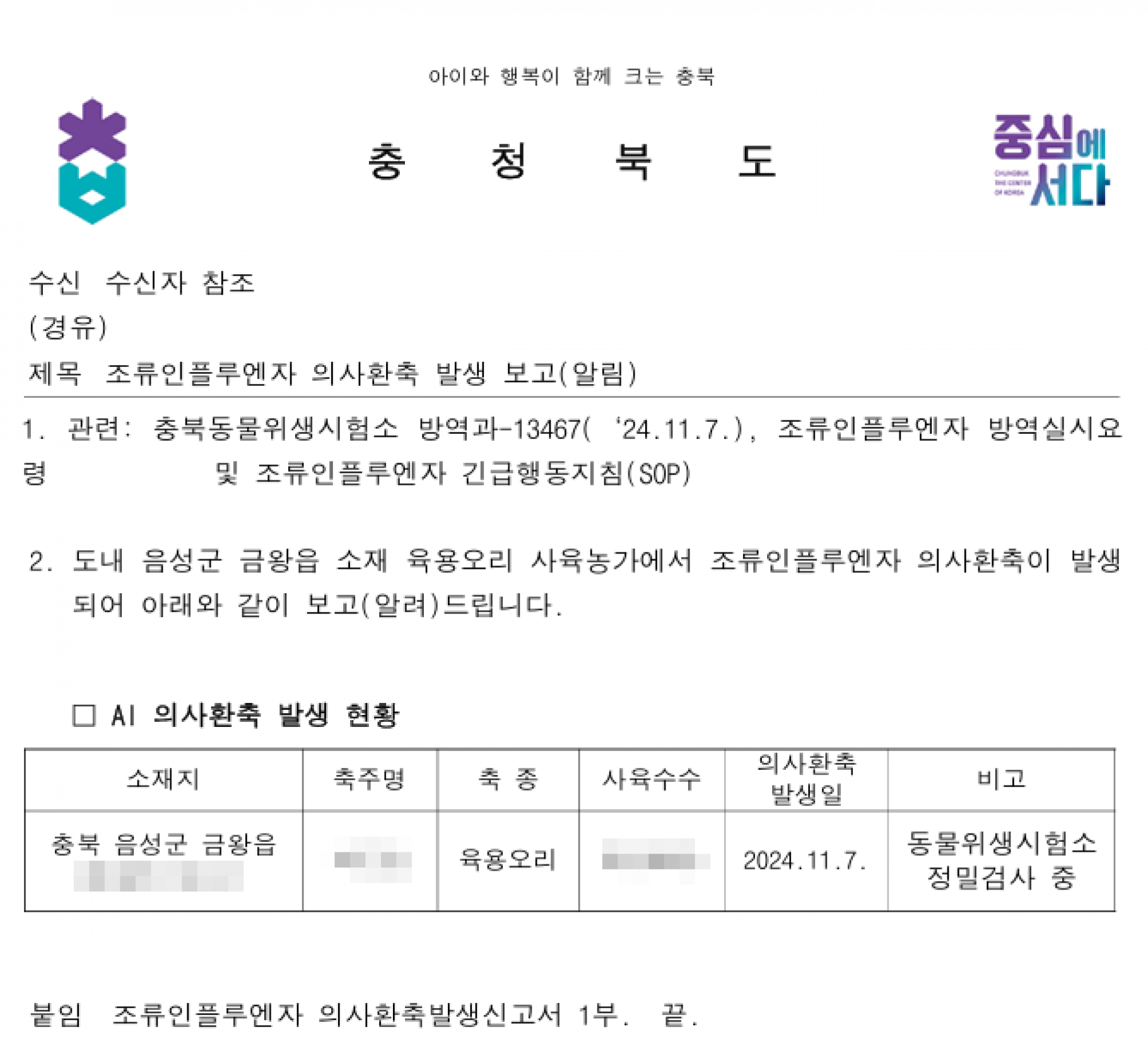 (충북 음성) 가금농장(육용오리) 고병원성 AI 의사환축 발생 보고
