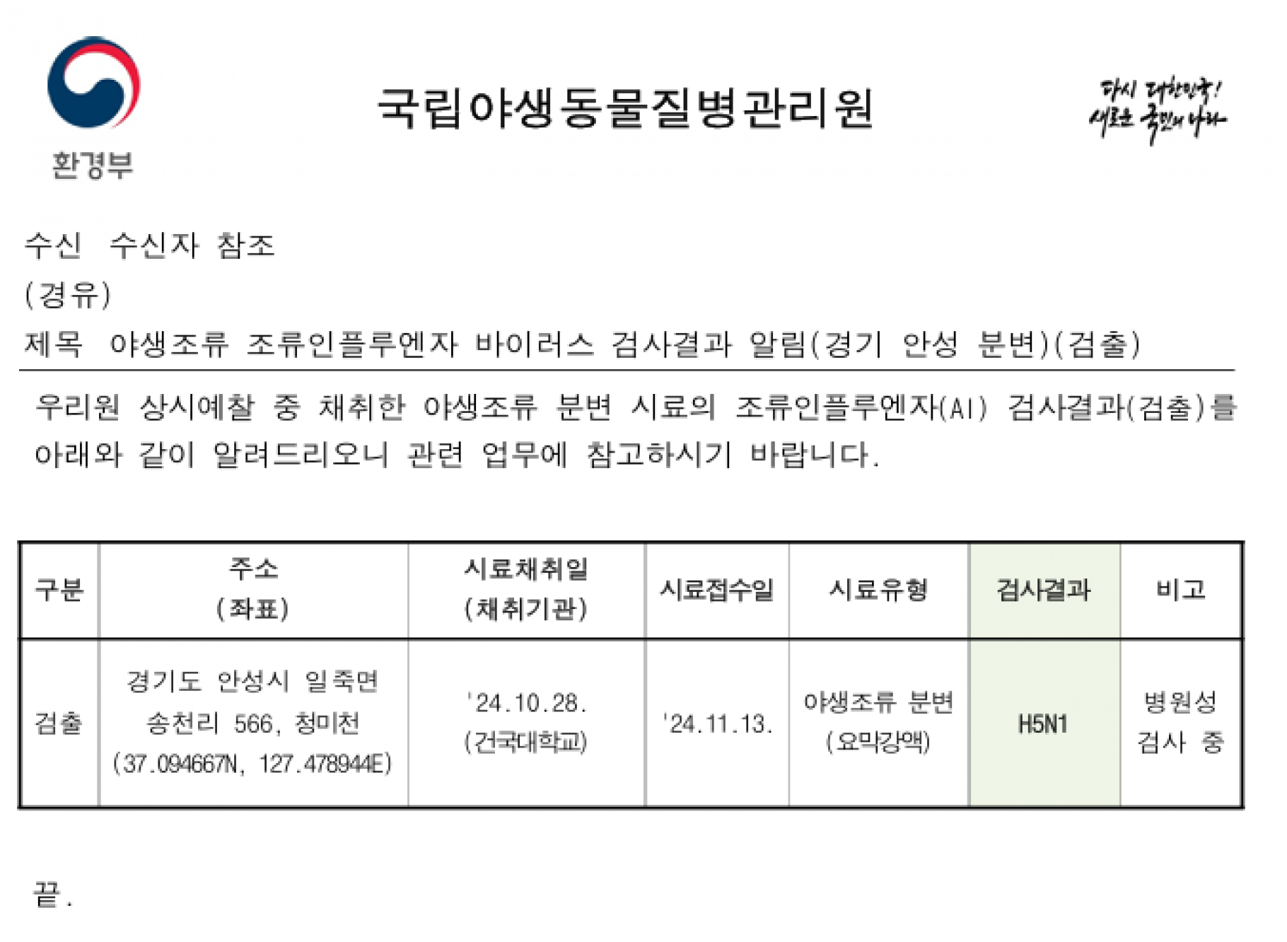 (경기 안성) 야생조류 조류인플루엔자(H5N1형) 항원 검출에 따른 차단방역 및 예찰 강화 알림
