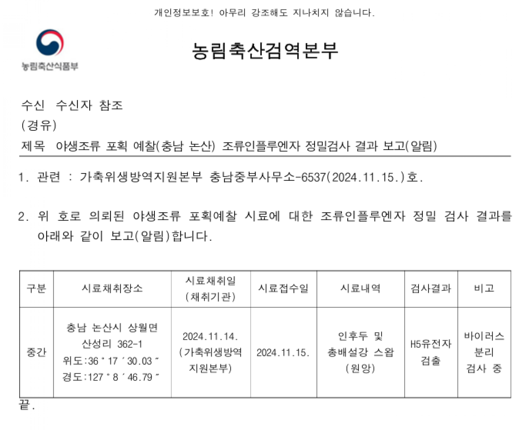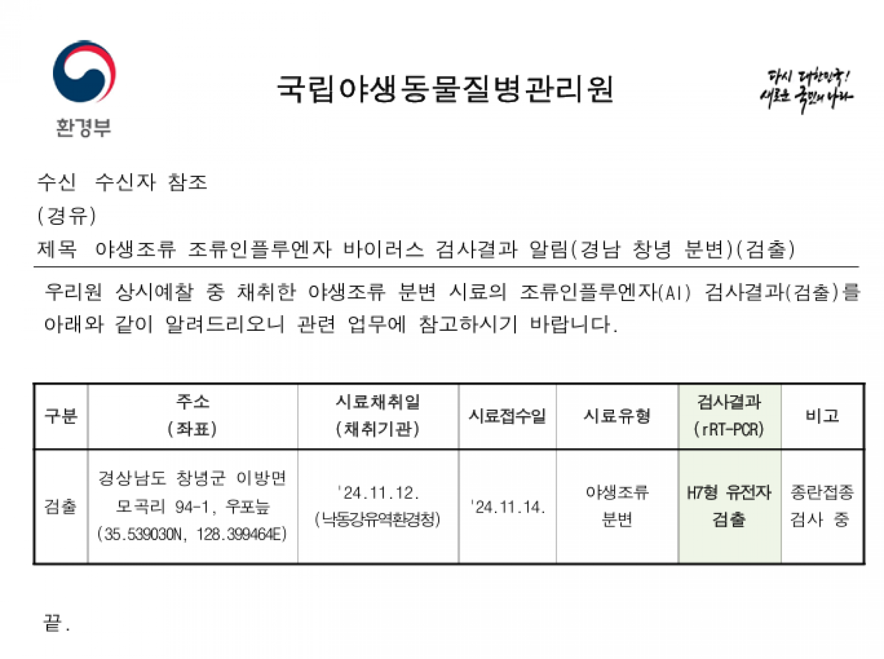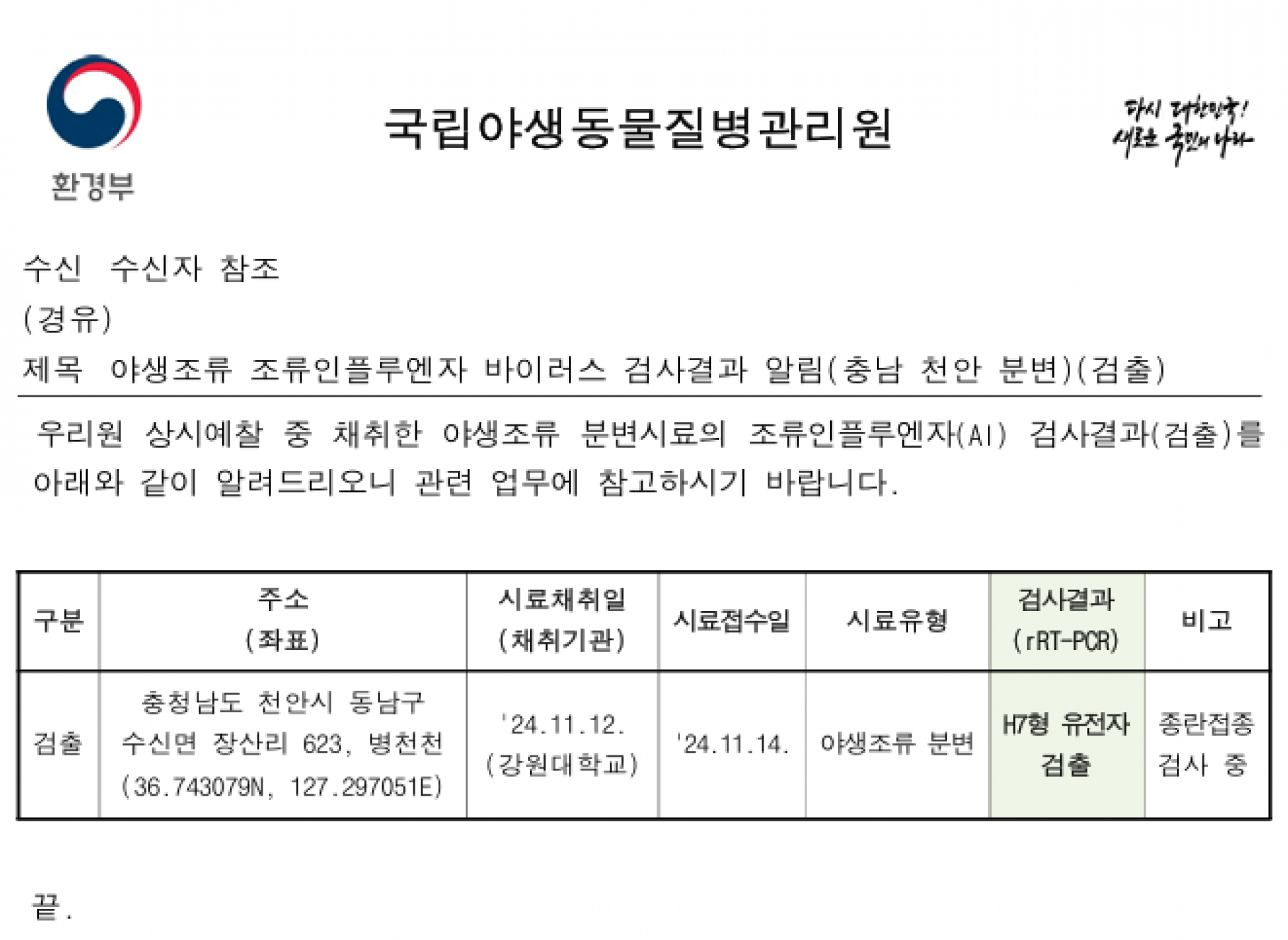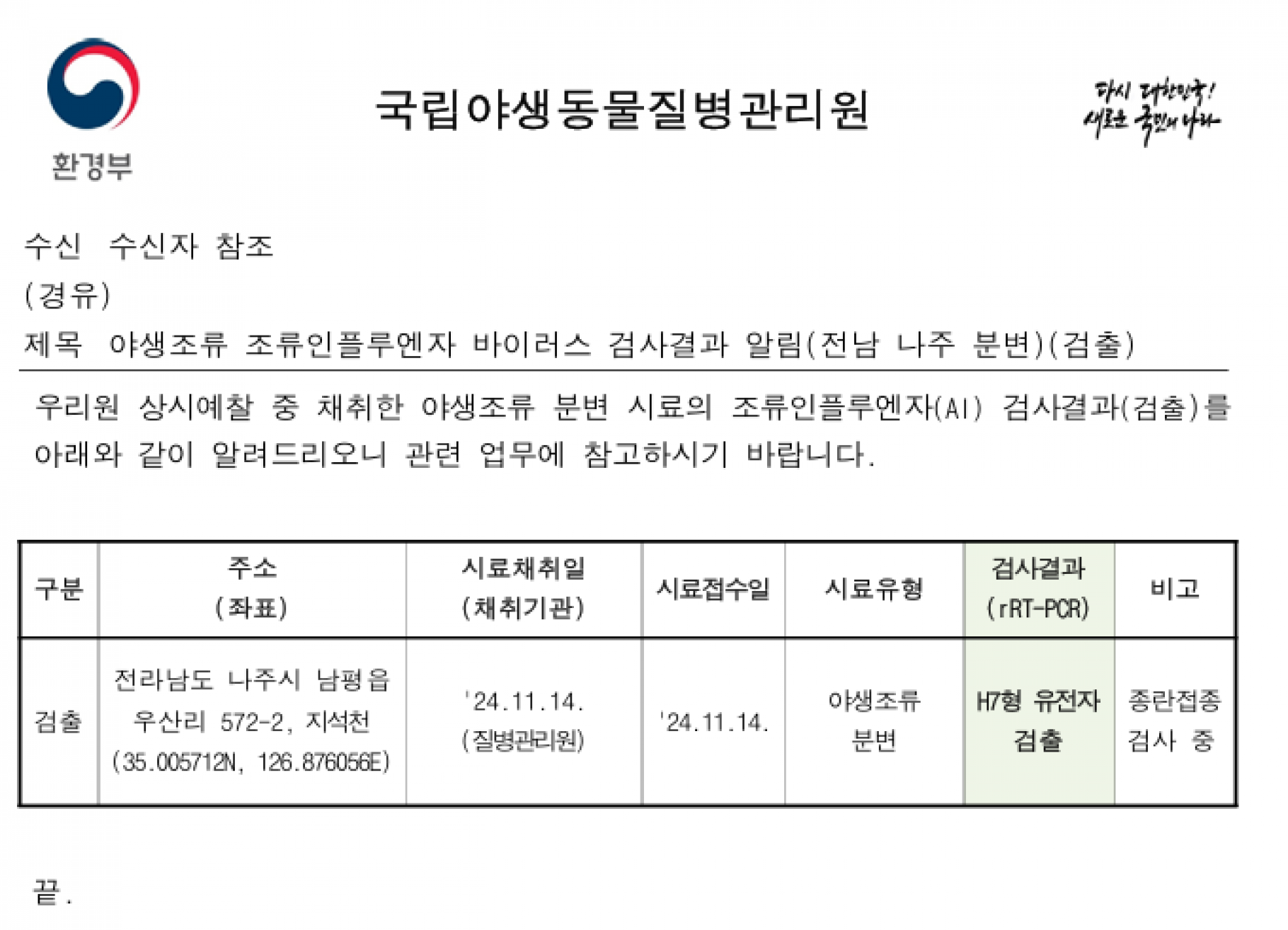 (경남 창녕 전남 나주 충남 천안 충남 논산) 야생조류 H5·H7형 조류인플루엔자(AI) 항원 검출에 따른 차단방역 및 예찰 강화 알림