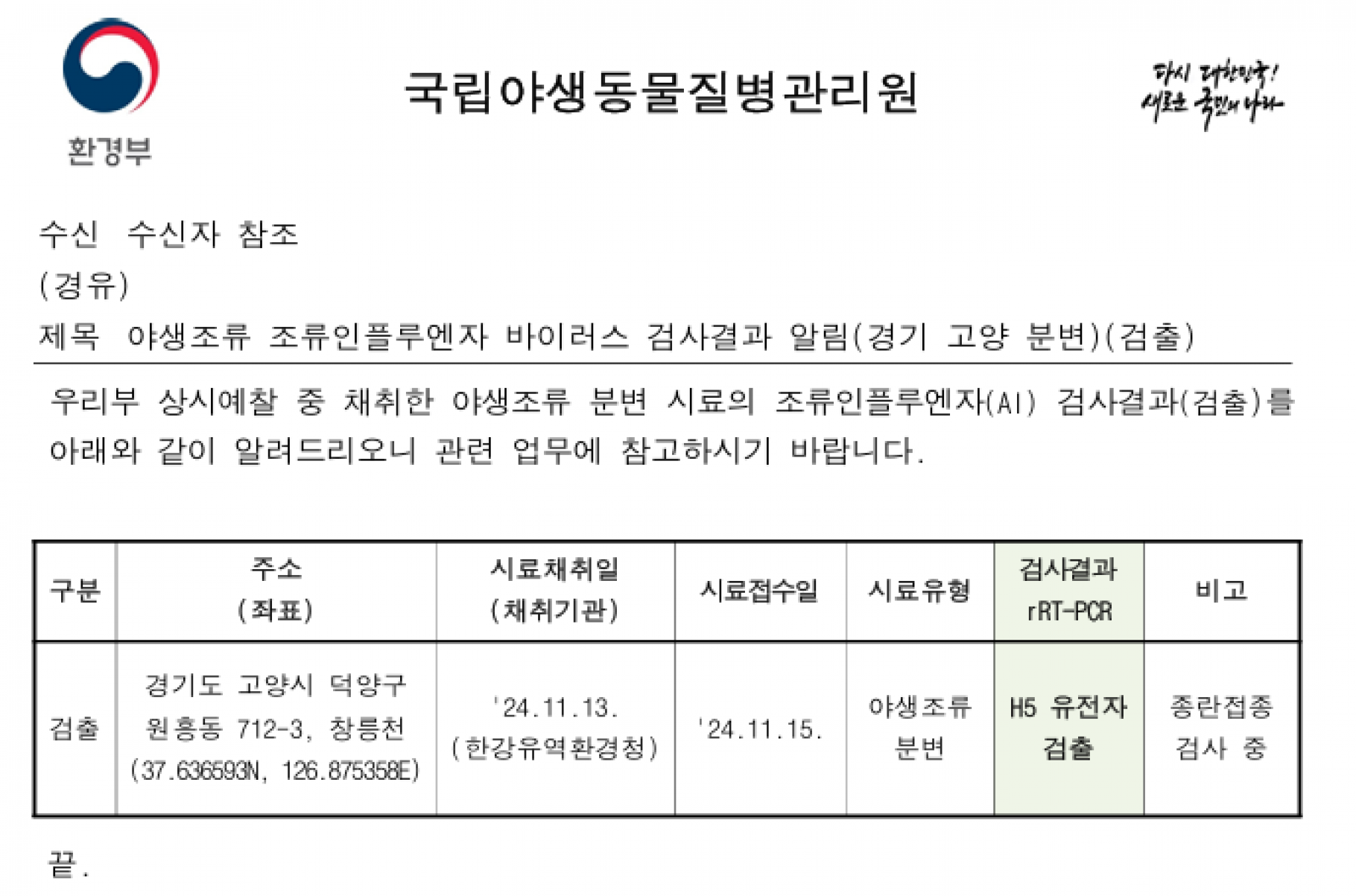 (경기 고양) 야생조류 조류인플루엔자(H5형) 항원 검출에 따른 차단방역 및 예찰 강화 알림