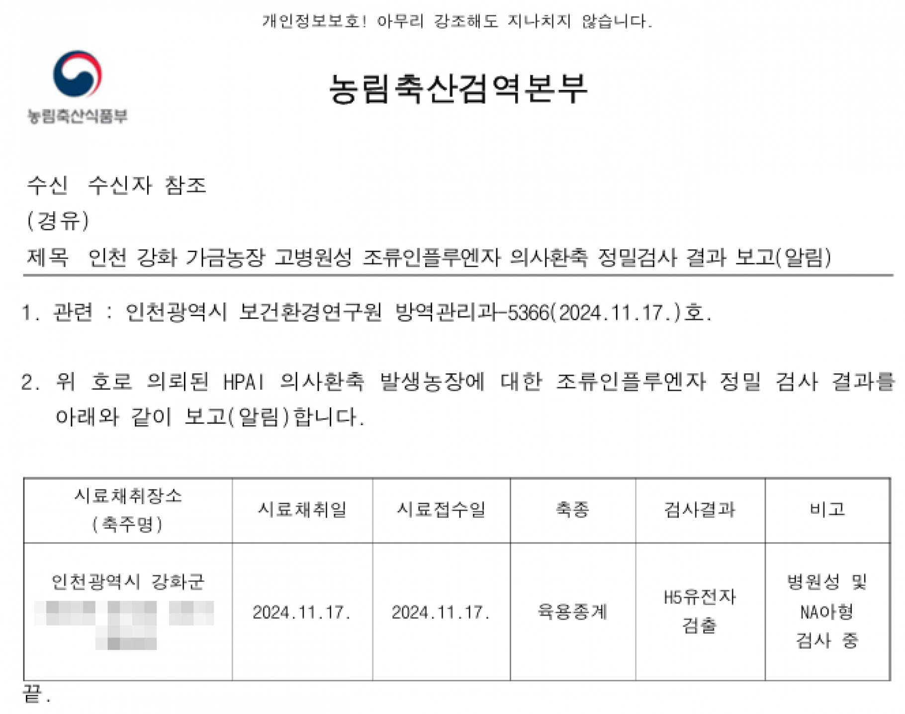 (인천 강화) 가금농장(육용종계) 고병원성 AI 의사환축 발생에 따른 방역강화 조치