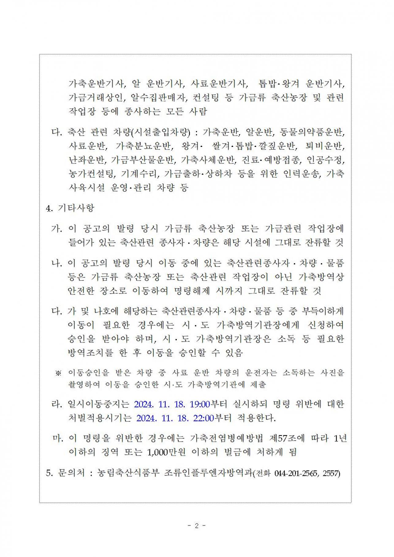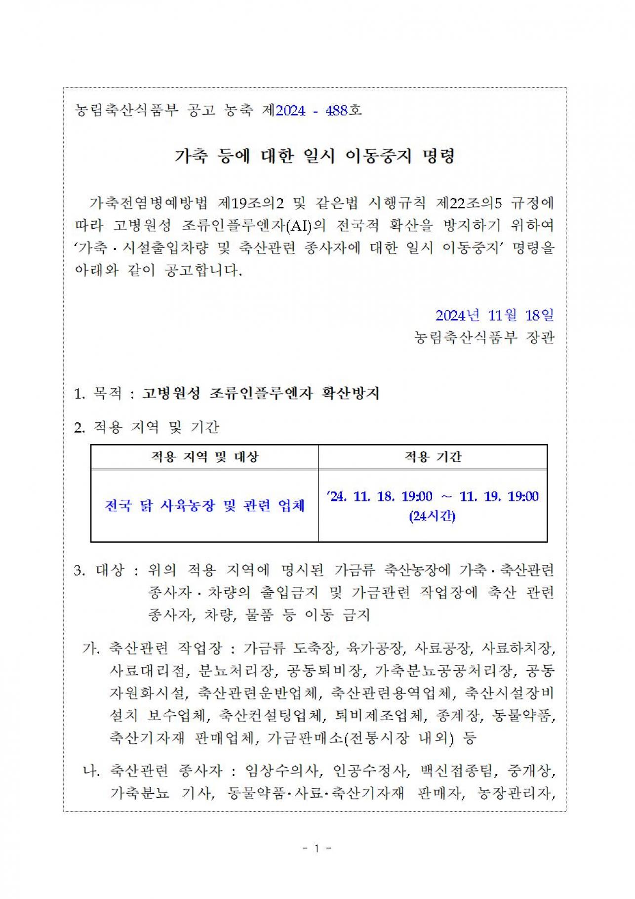 가축(가금) 등에 대한 일시 이동중지(Standstill)명령 발령 알림