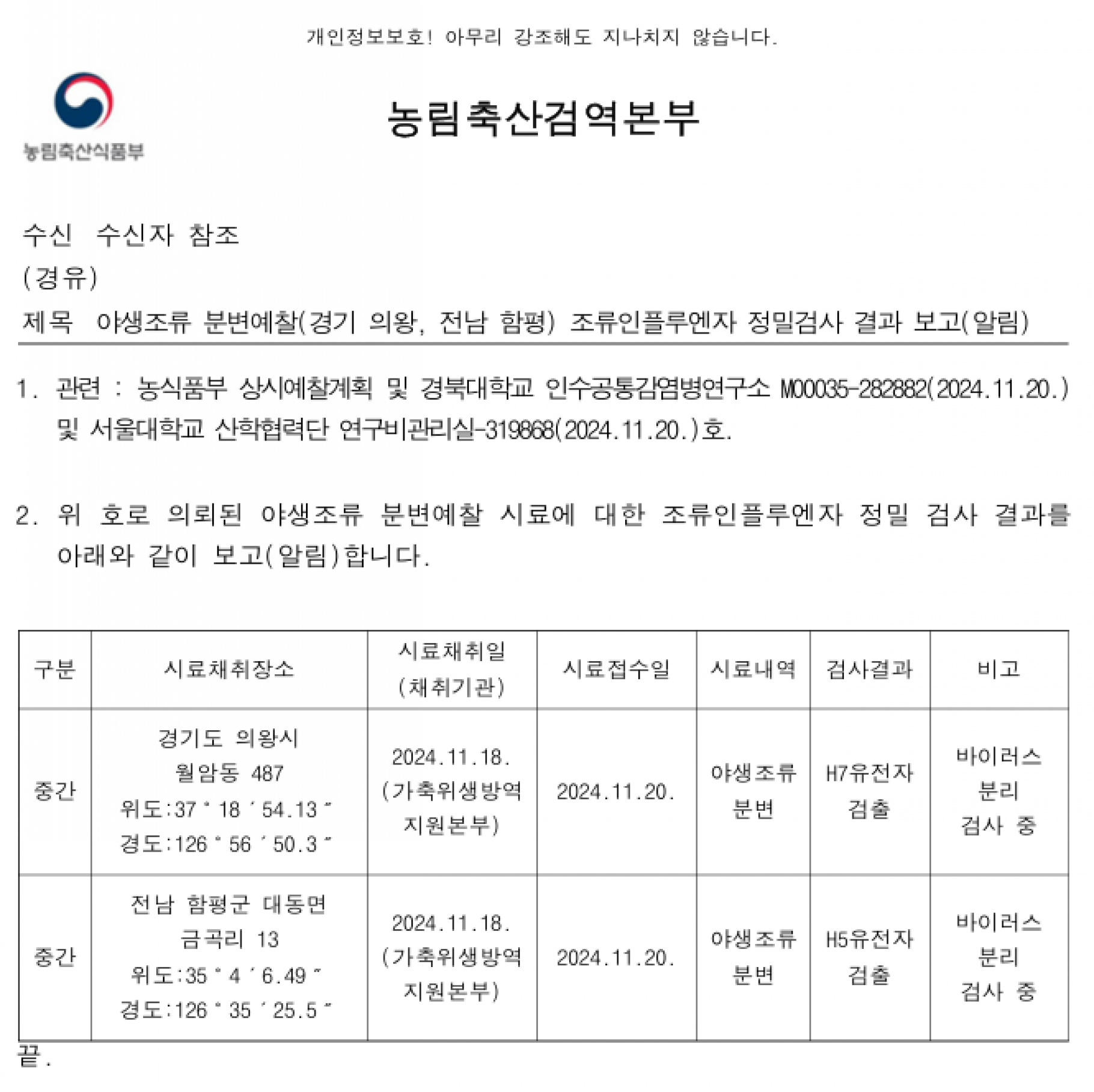 (경기 의왕, 전남 함평) 야생조류 조류인플루엔자(H5·H7) 항원 검출에 따른 차단방역 및 예찰 강화 알림