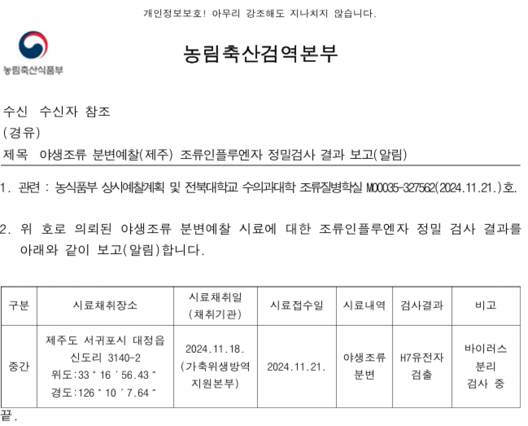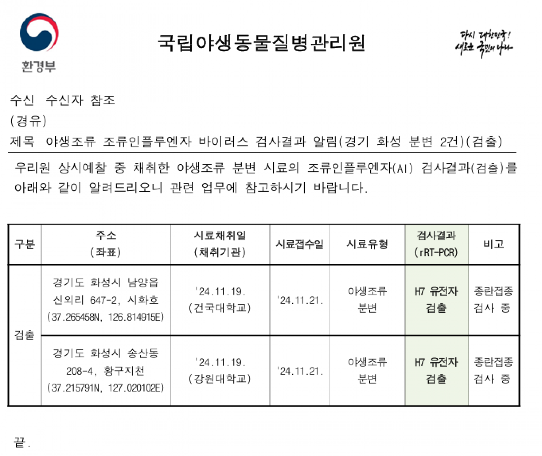 (제주 서귀포,경기도 화성) 야생조류 조류인플루엔자(H7형) 항원 검출에 따른 차단방역 및 예찰 강화 알림