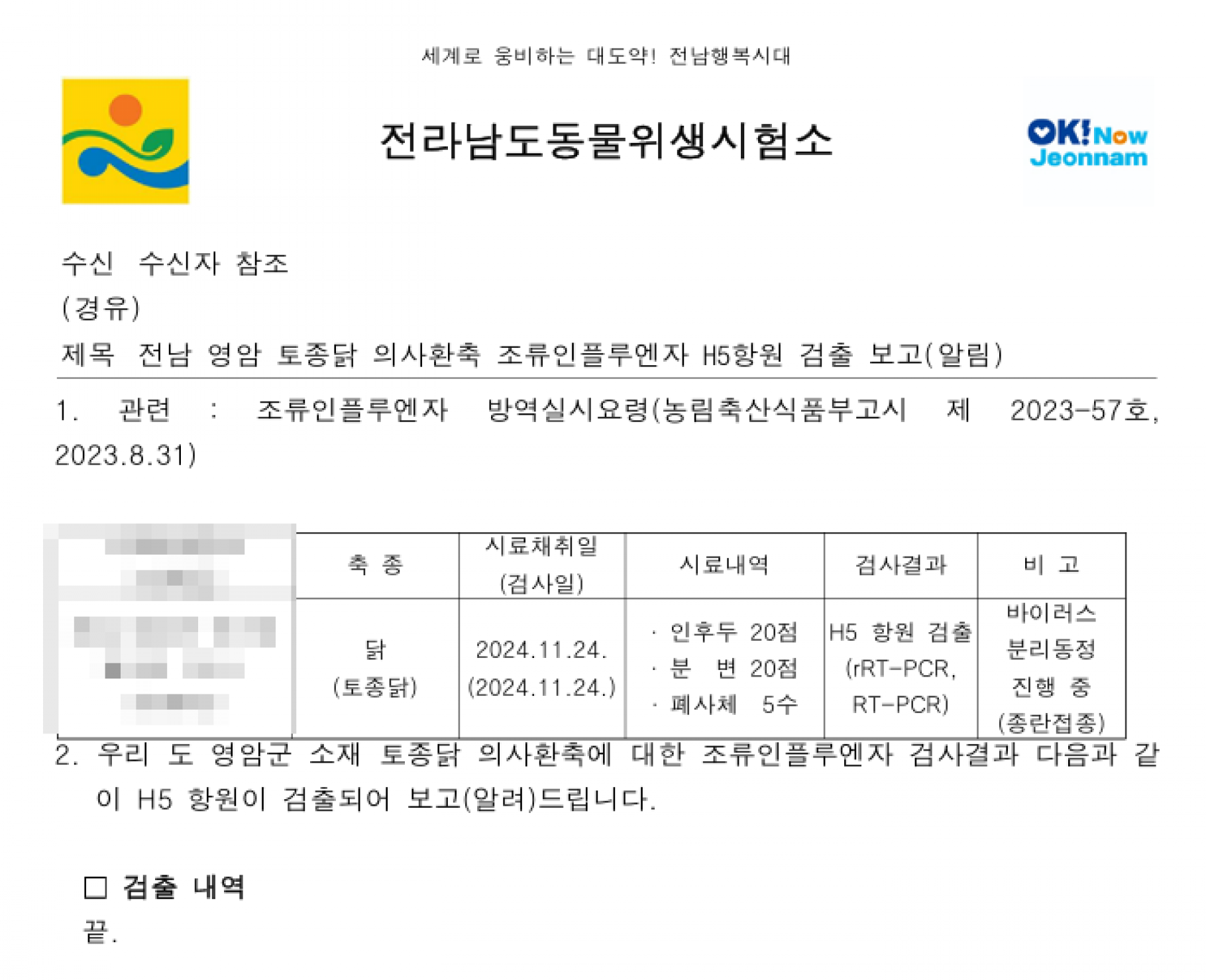 (전남 영암) 가금농장(토종닭) 고병원성 AI 의사환축 발생에 따른 방역강화 조치