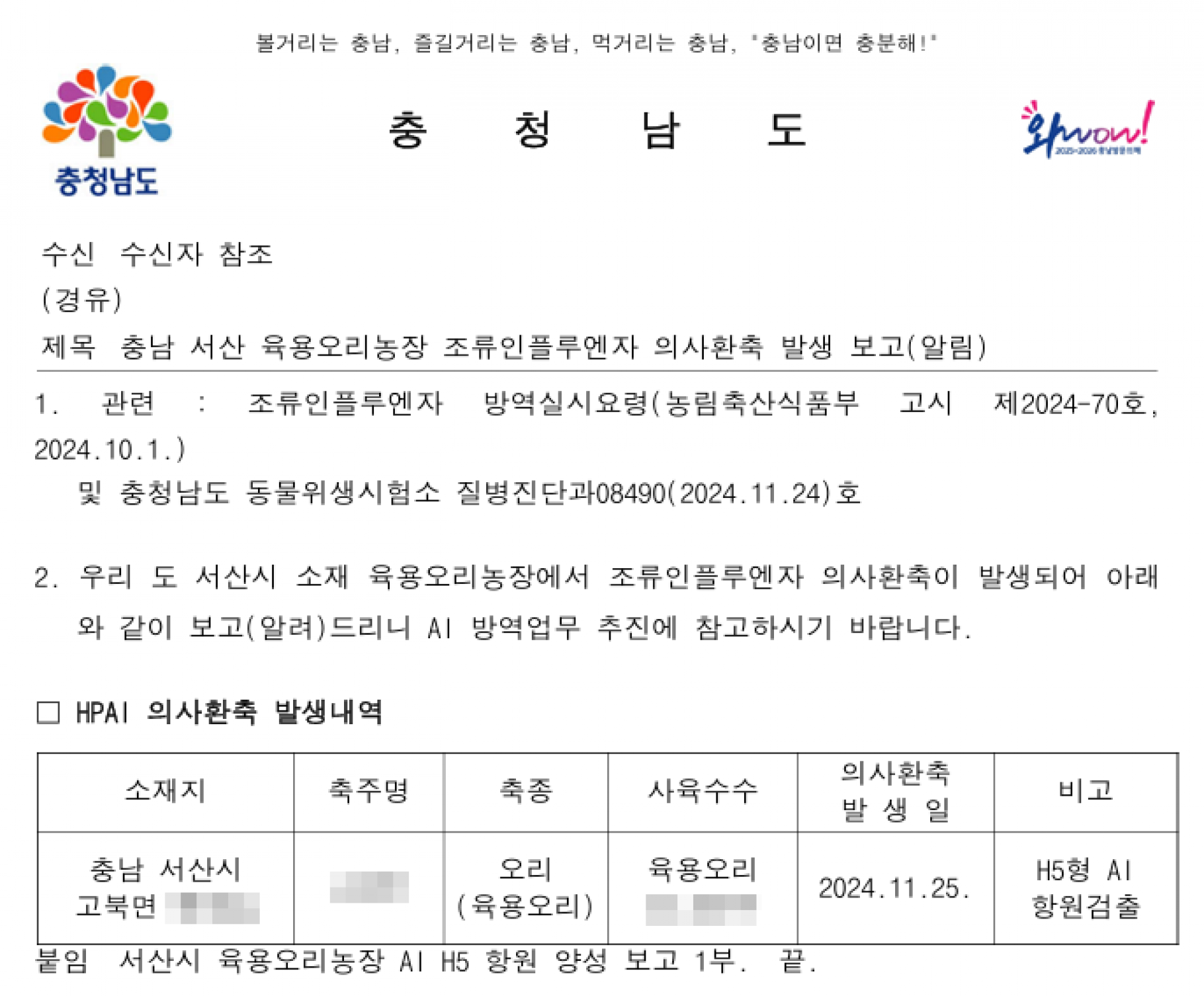 (충남 서산) 가금농장(육용오리)고병원성 AI 의사환축 발생에 따른 방역강화 조치