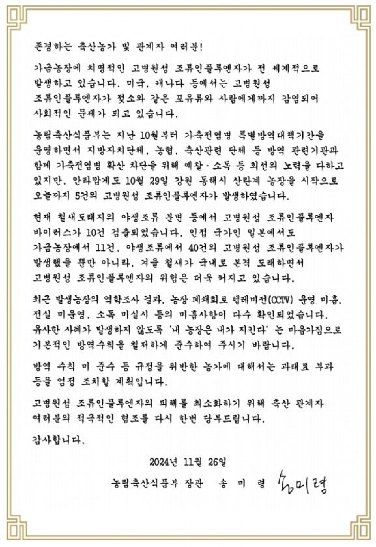 고병원성 조류인플루엔자 방역관련 농림축산식품부 장관 서한문