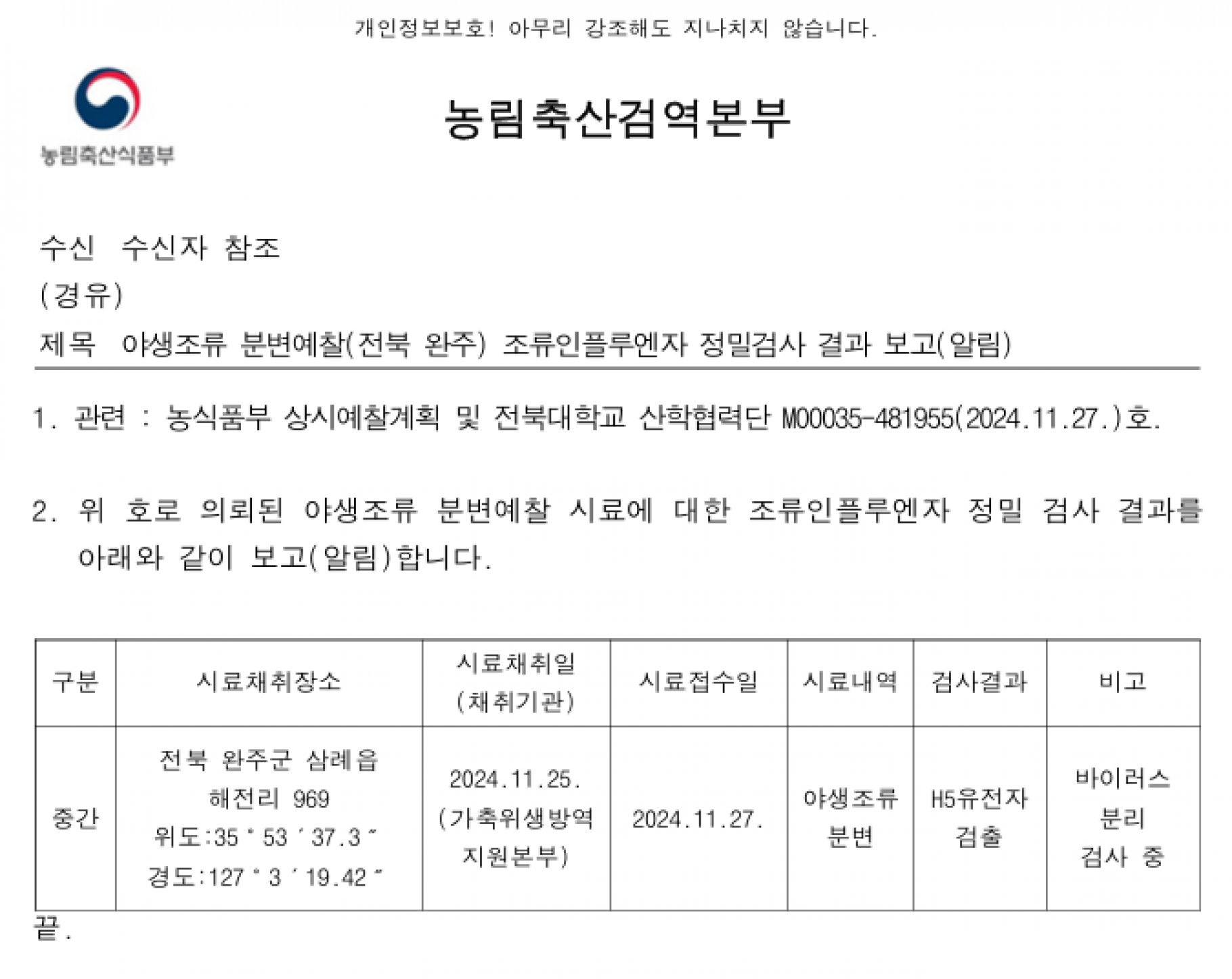 (전북 완주) 야생조류 조류인플루엔자(H5형) 항원 검출에 따른 차단방역 및 예찰 강화 알림