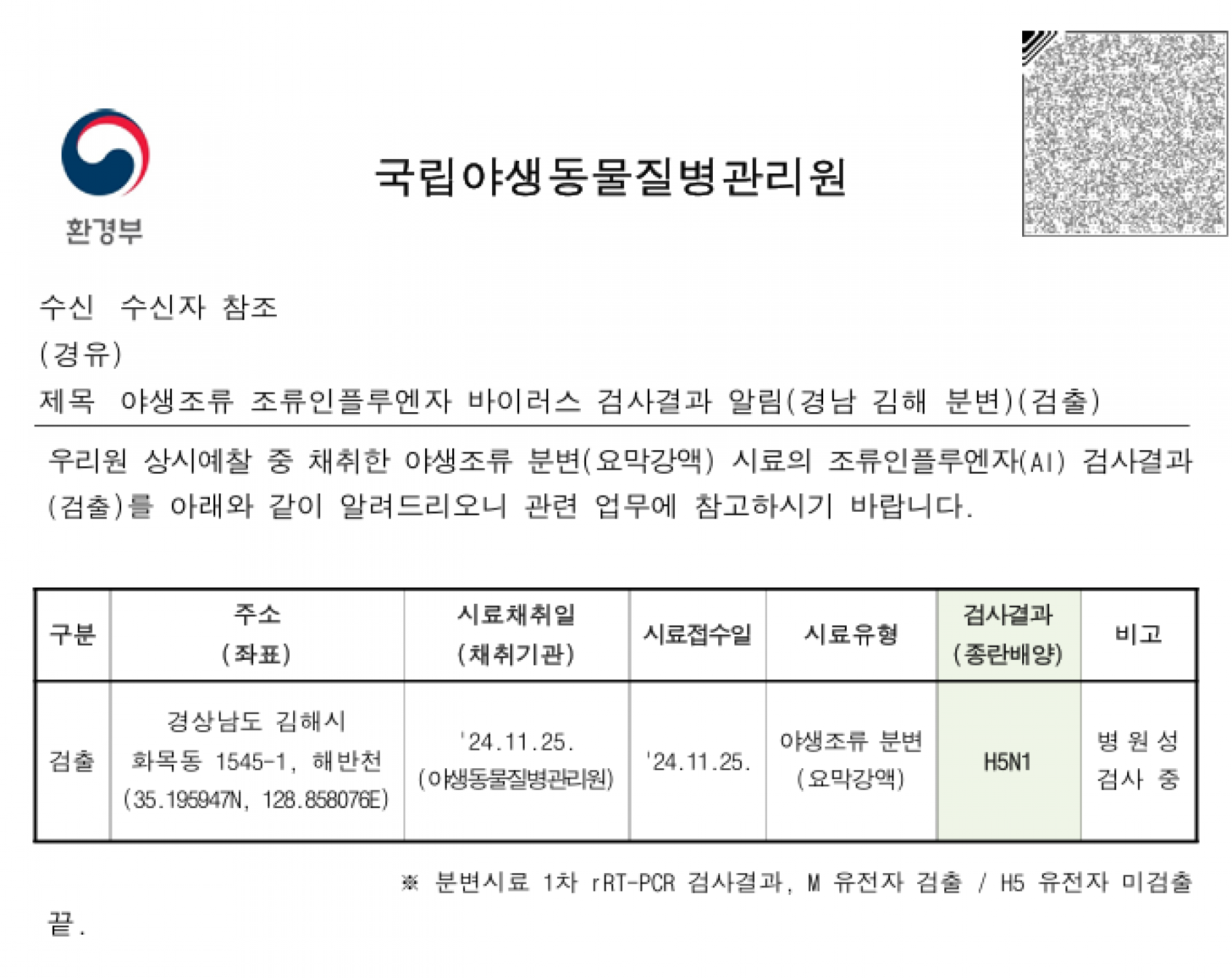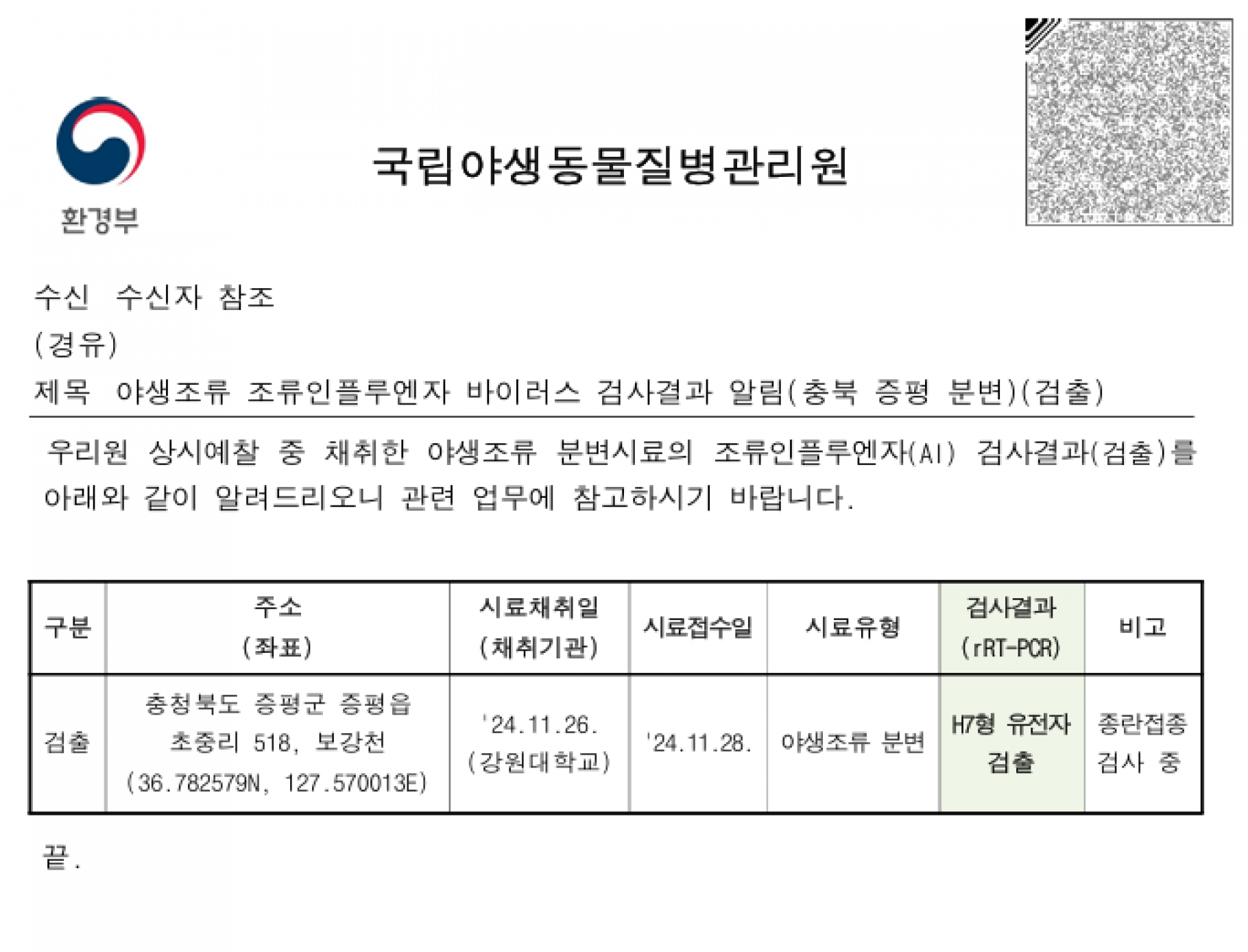 (경남 김해·충북 증평)야생조류 조류인플루엔자(H5N1·H7) 항원 검출에 따른 차단방역 및 예찰 강화 알림