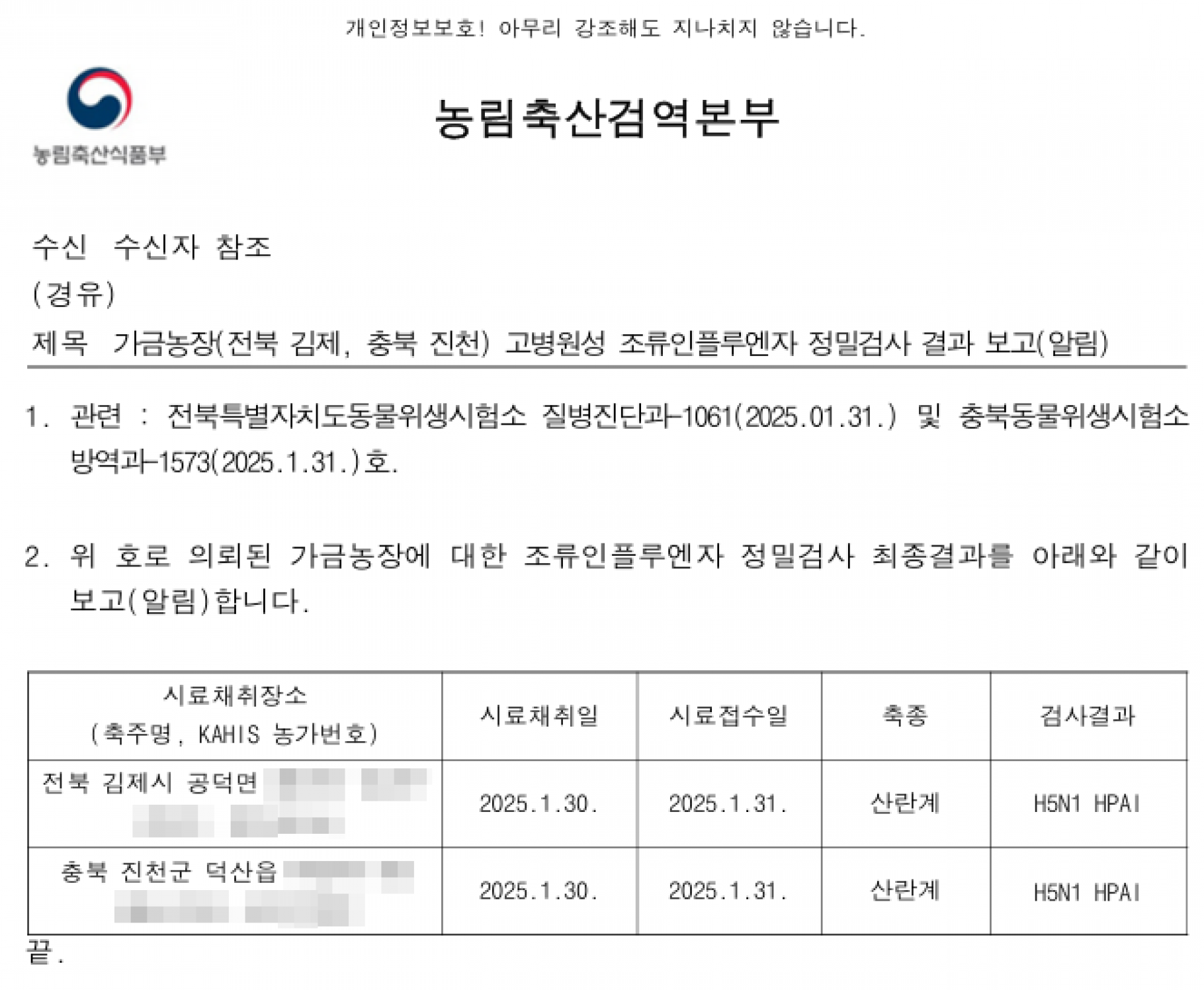 전북 김제시 가금농장(산란계) 고병원성 조류인플루엔자(AI) 확진에 따른 방역조치 알림