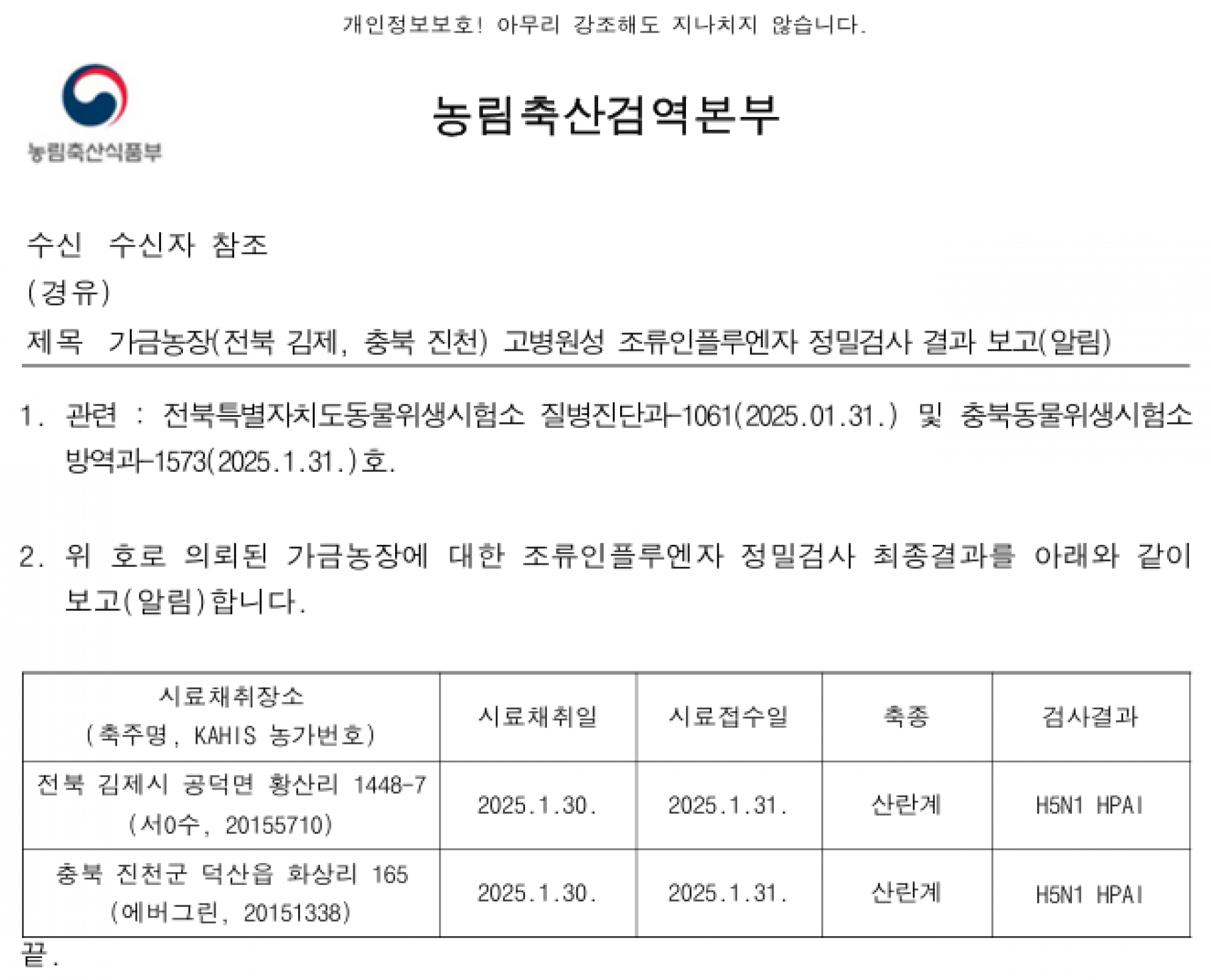 전북 김제시 가금농장(산란계) 고병원성 조류인플루엔자(AI) 확진에 따른 방역조치 알림