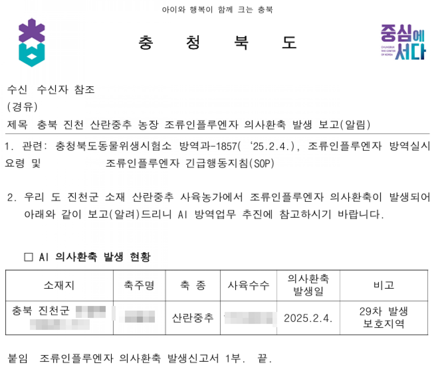 충북 진천 가금농장(산란중추) 고병원성 AI 의사환축 발생에 따른 방역강화 조치