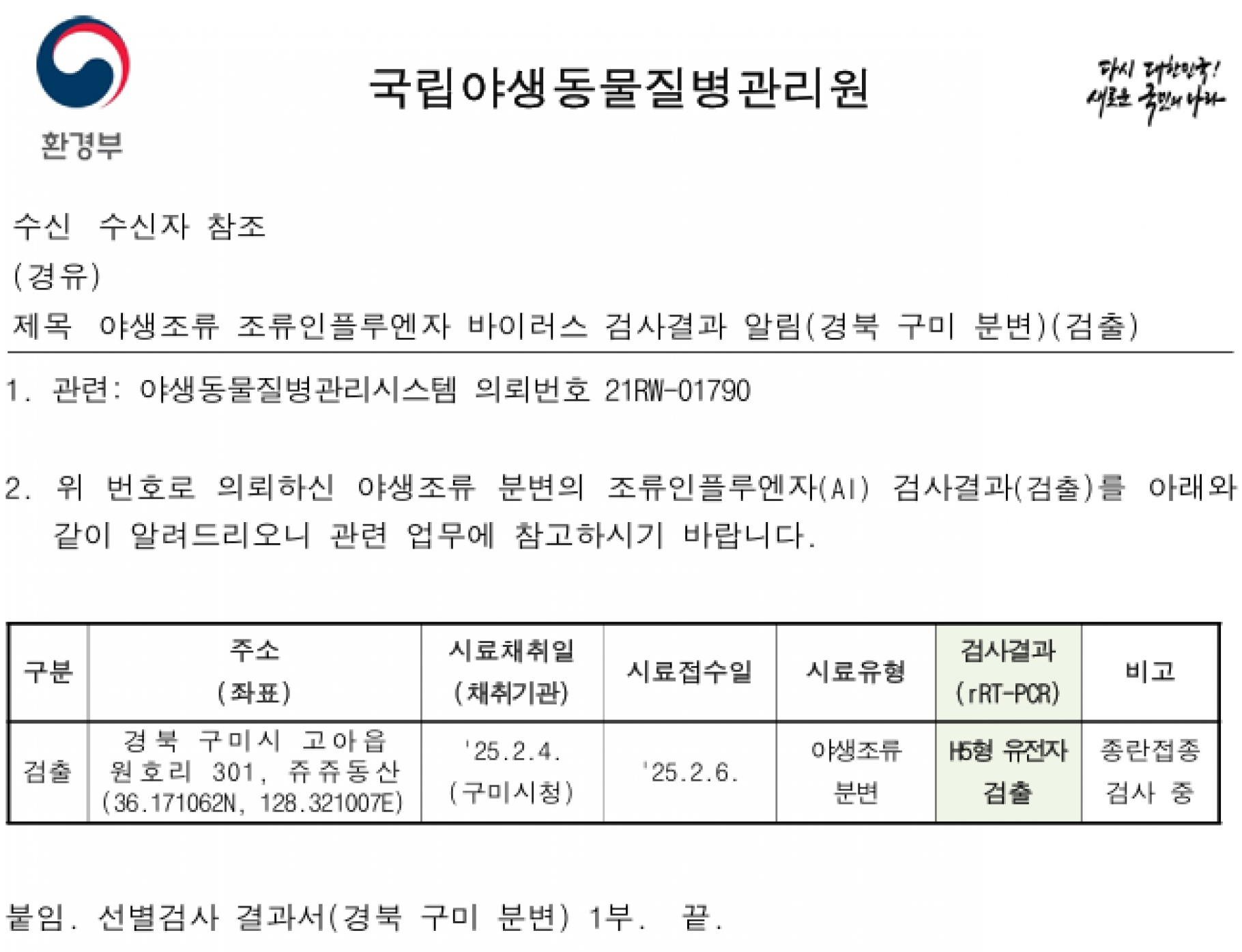 (경북 구미)야생조류 조류인플루엔자(H5) 항원 검출에 따른 차단방역 및 예찰 강화 알림