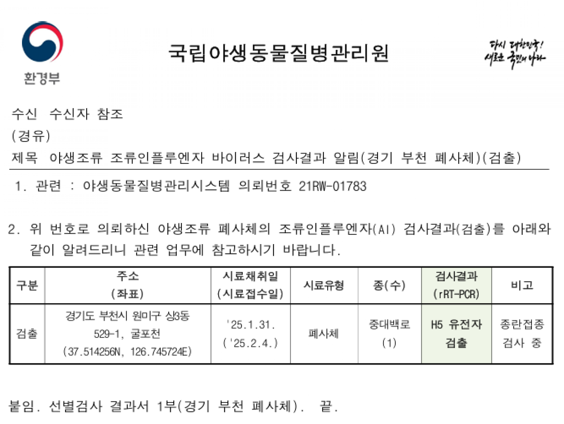 (경기 부천)야생조류 고병원성 조류인플루엔자(H5N1형) 검출에 따른 차단방역 강화 알림