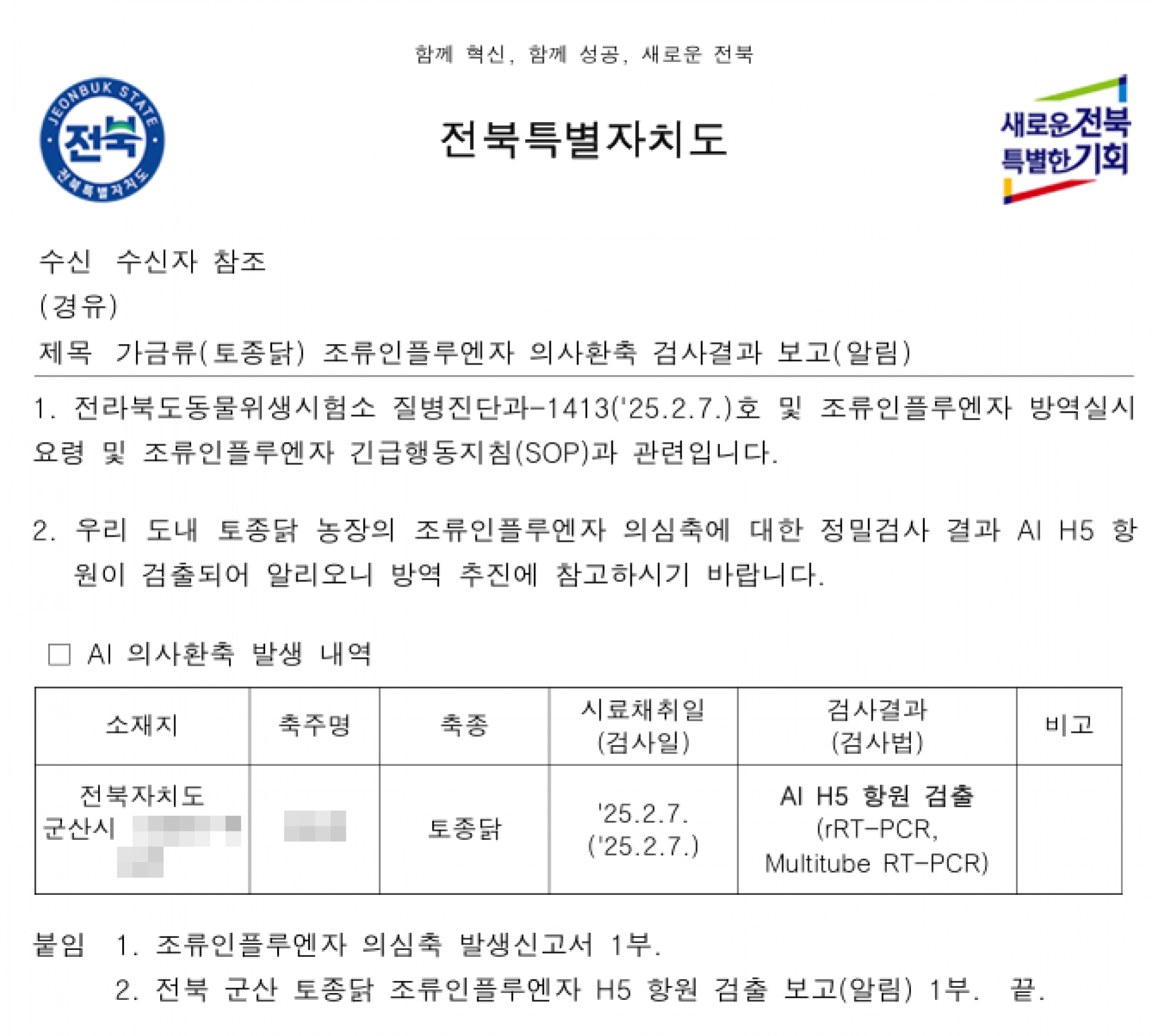 전북 군산 가금농장(토종닭) 고병원성 AI 의사환축 발생에 따른 방역강화 조치