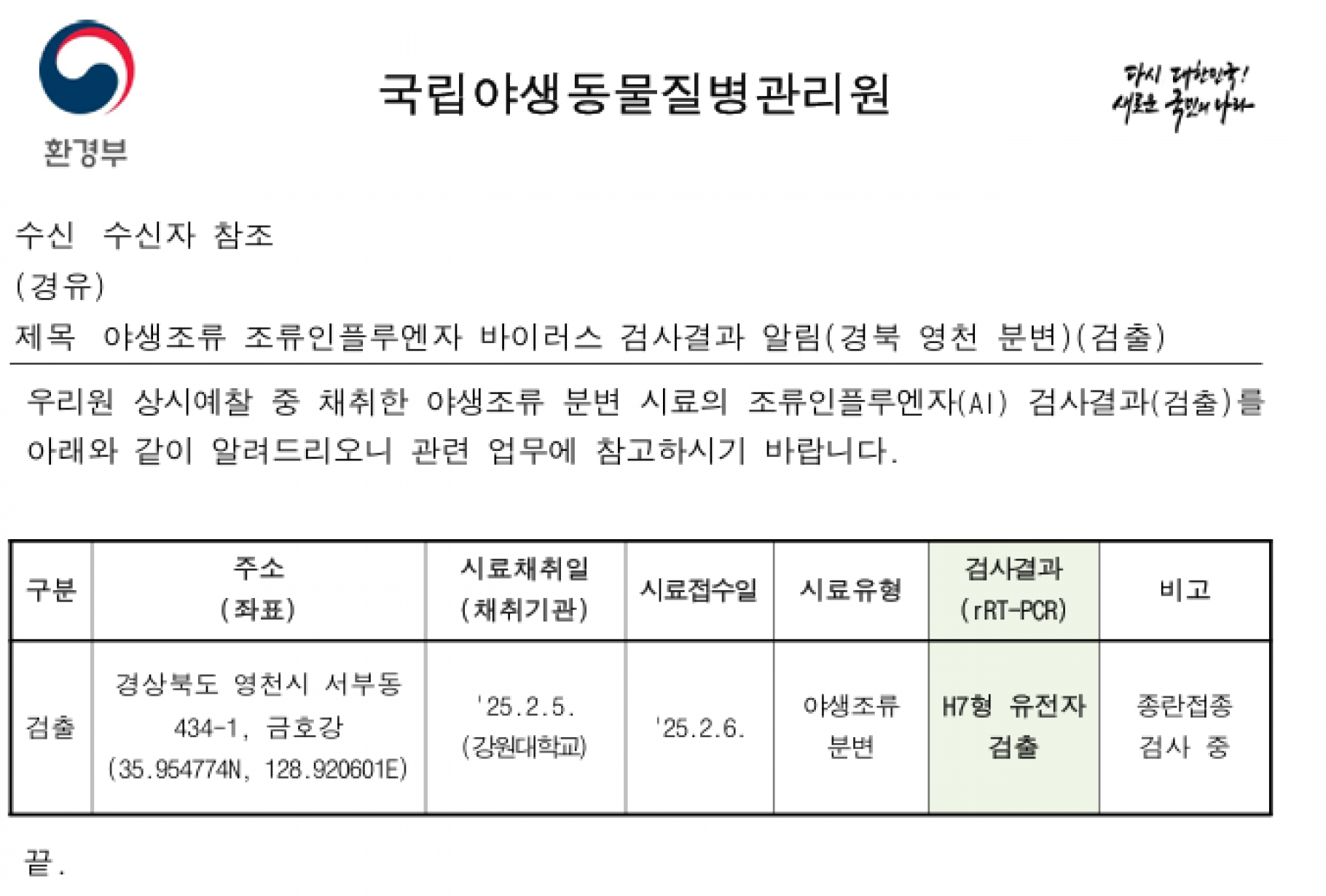 (경북 영천)야생조류 조류인플루엔자(H7) 항원 검출에 따른 차단방역 및 예찰 강화 알림