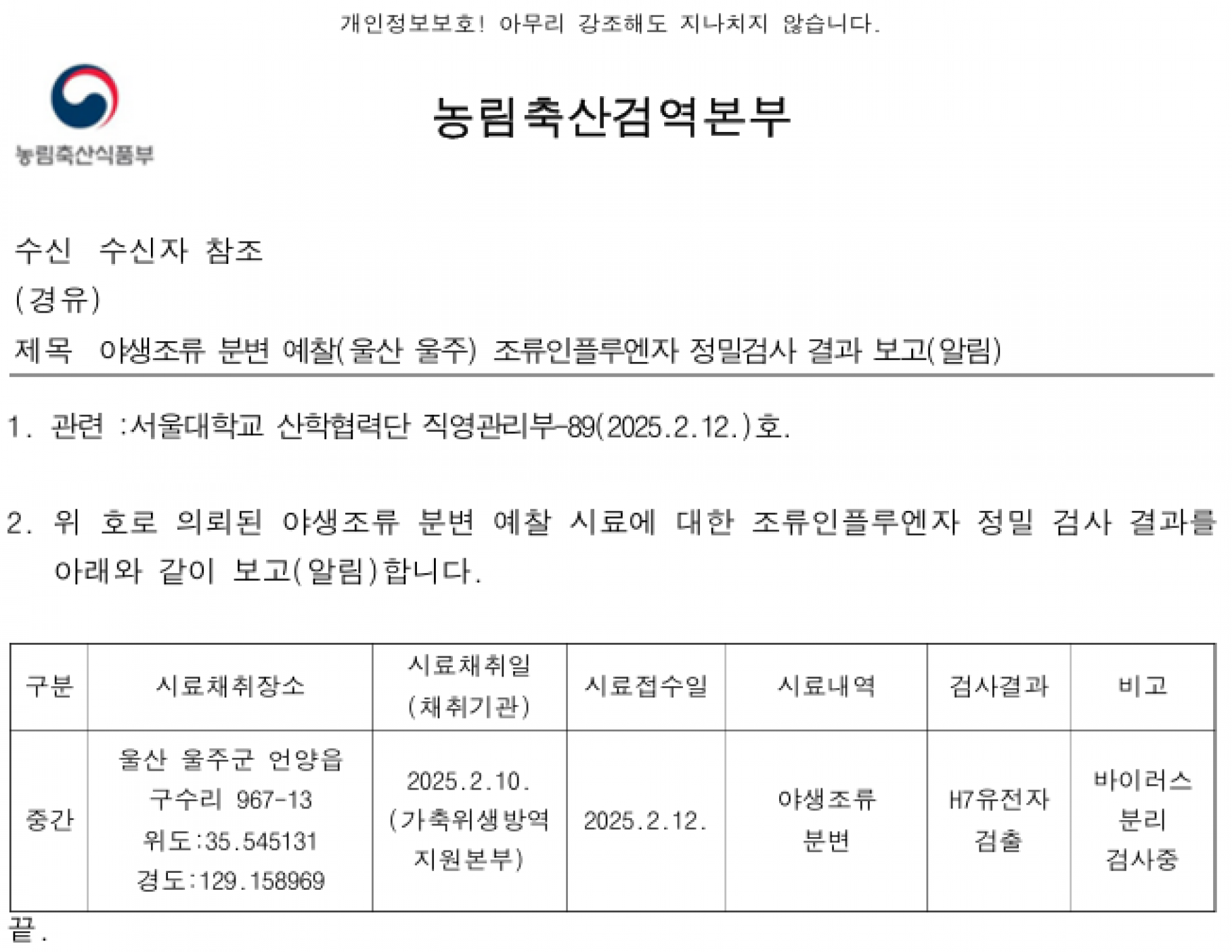 (울산 울주군)야생조류 조류인플루엔자(H7) 항원 검출에 따른 차단방역 및 예찰 강화 알림