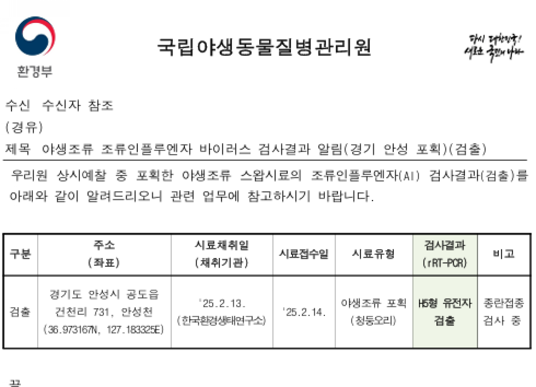 (경기 안성) 야생조류 조류인플루엔자(H5) 항원 검출에 따른 차단방역 및 예찰 강화 알림
