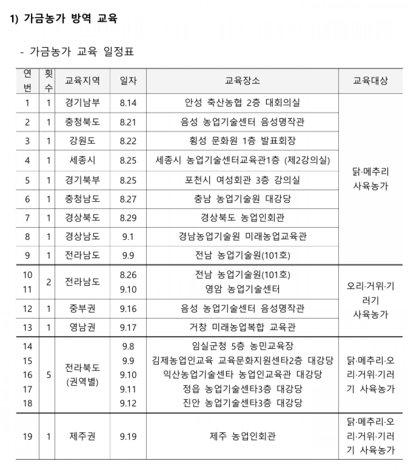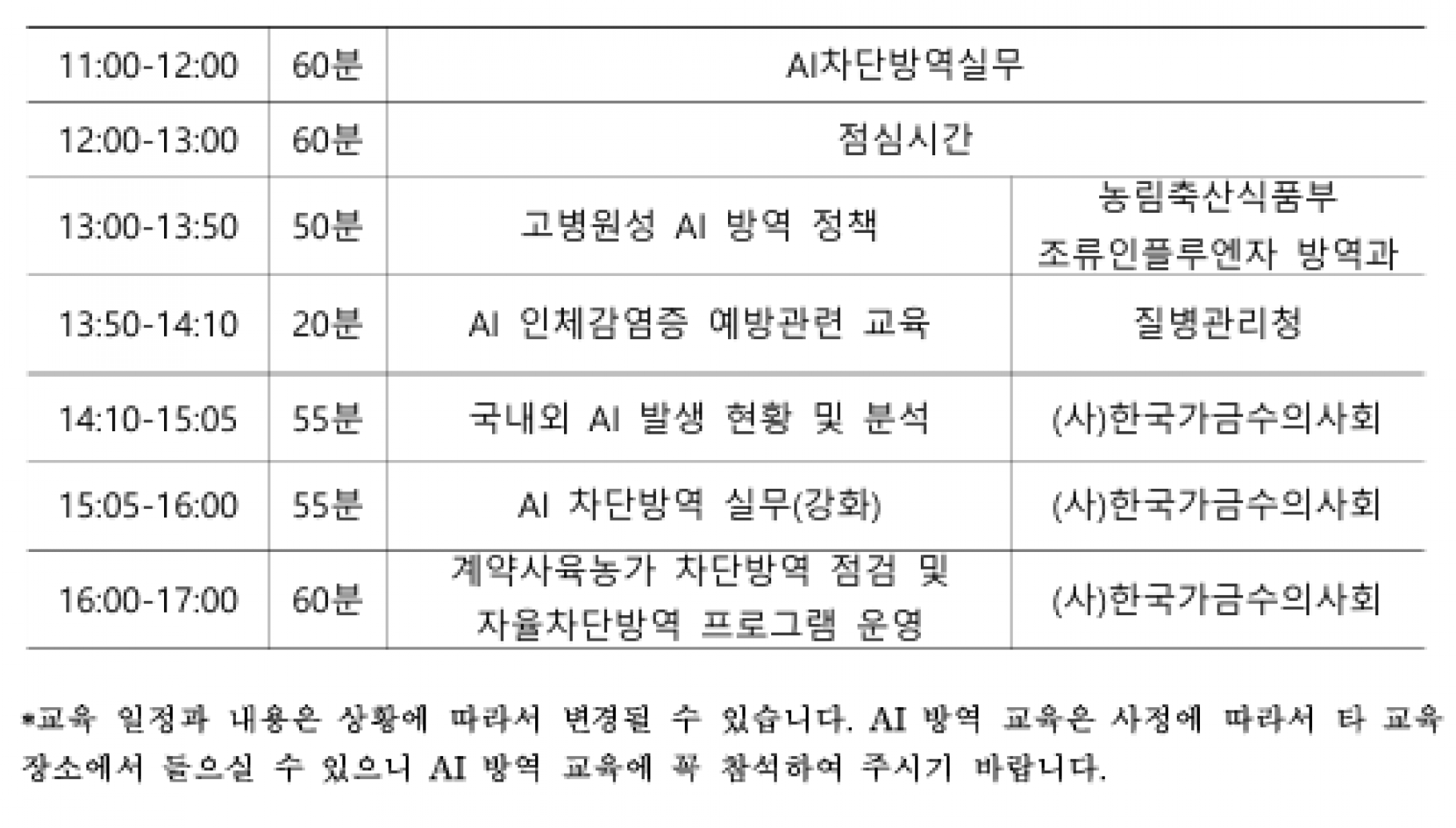 정부에서는 고병원성 AI 예방 및 차단방역 역량 제고를 위해 아래와 같이 차단방역 교육을 실시합니다. 교육 참석시 교육 이수증을 발급할 예정이라고 하니, 농가에서는 교육에 참여하여 주시기 바랍니다.