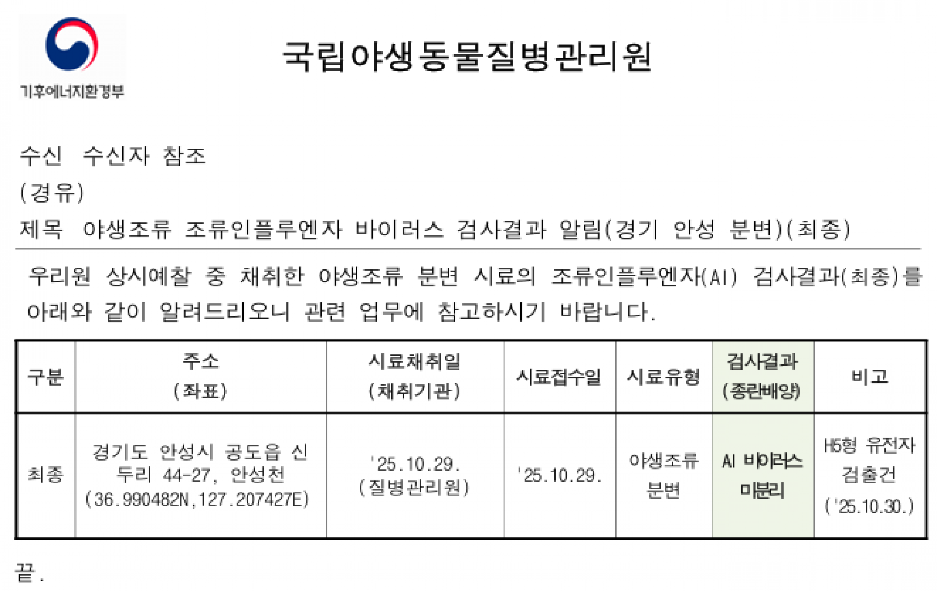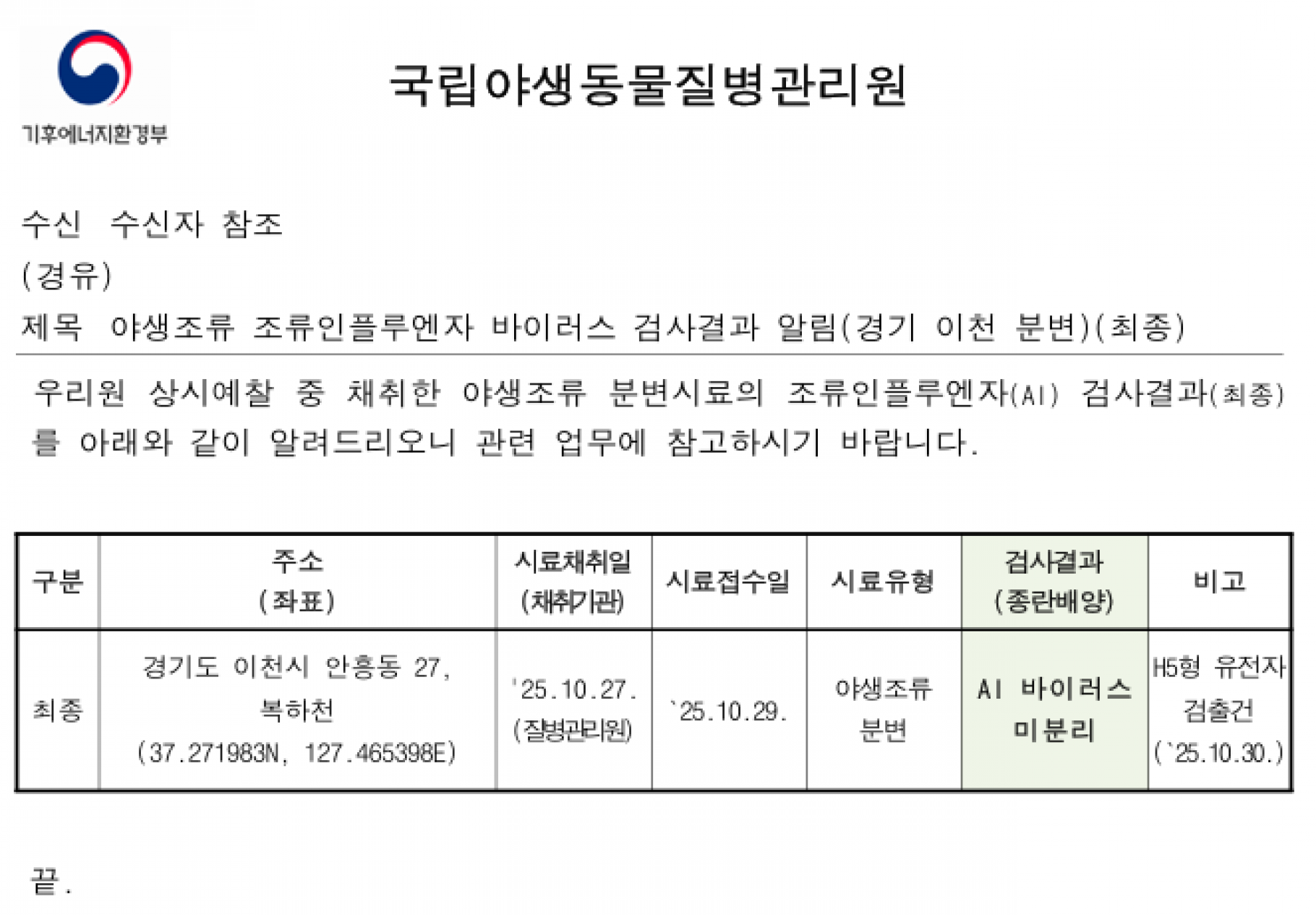 경기(안성), 경기(오산), 경기(이천) 및 전북(김제) 소재 야생조류 AI 항원 미분리 지점 관리