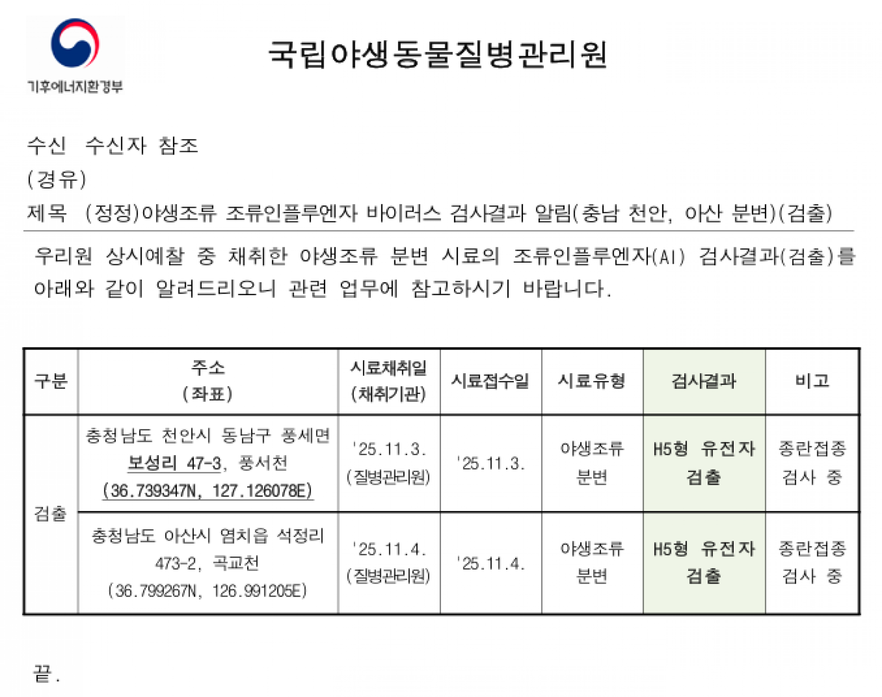 (충남 천안, 아산, 충북 제천, 전북 정읍) 야생조류 조류인플루엔자(H5) 항원 검출에 따른 차단방역 및 예찰 강화 알림